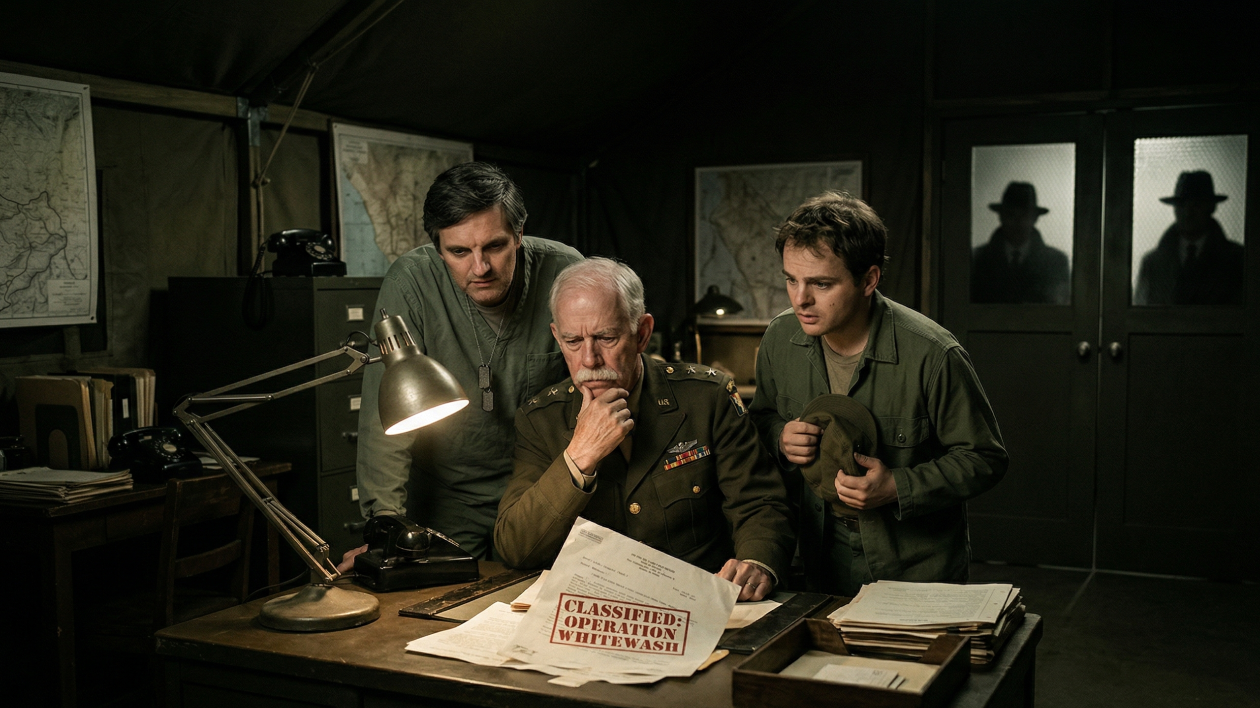 “Keep your voice down, Pierce,” Potter hushed, his eyes fixed on the frosted glass of his office door. Two large shadows loomed outside. Men in trench coats. In Korea. You only wear a trench coat in a combat zone if you’re trying to hide a lack of a soul.