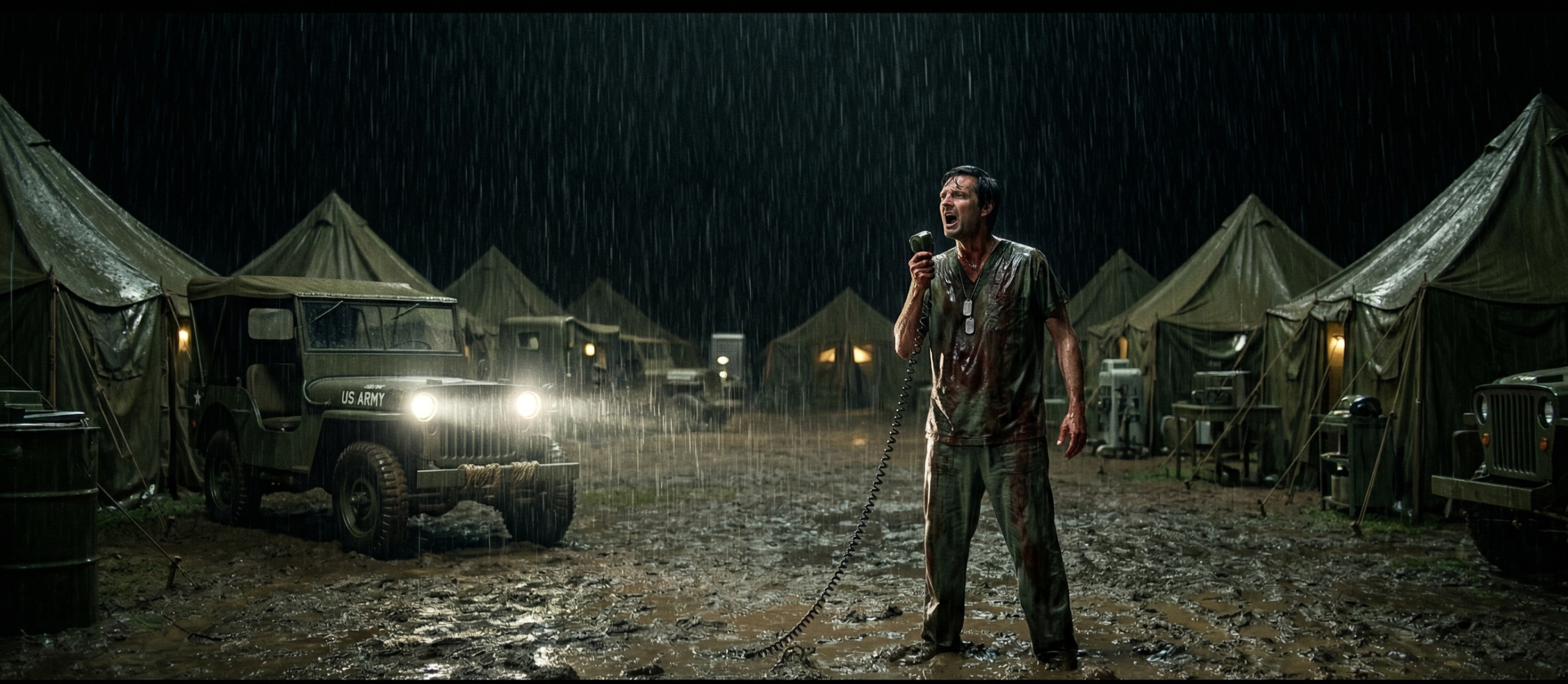 Hawkeye stood in the center of the compound. The freezing Korean rain washed the blood from his surgical gown, turning the mud beneath his boots a rusty red. He held the silver microphone with a white-knuckled grip, staring into the dark, indifferent sky.