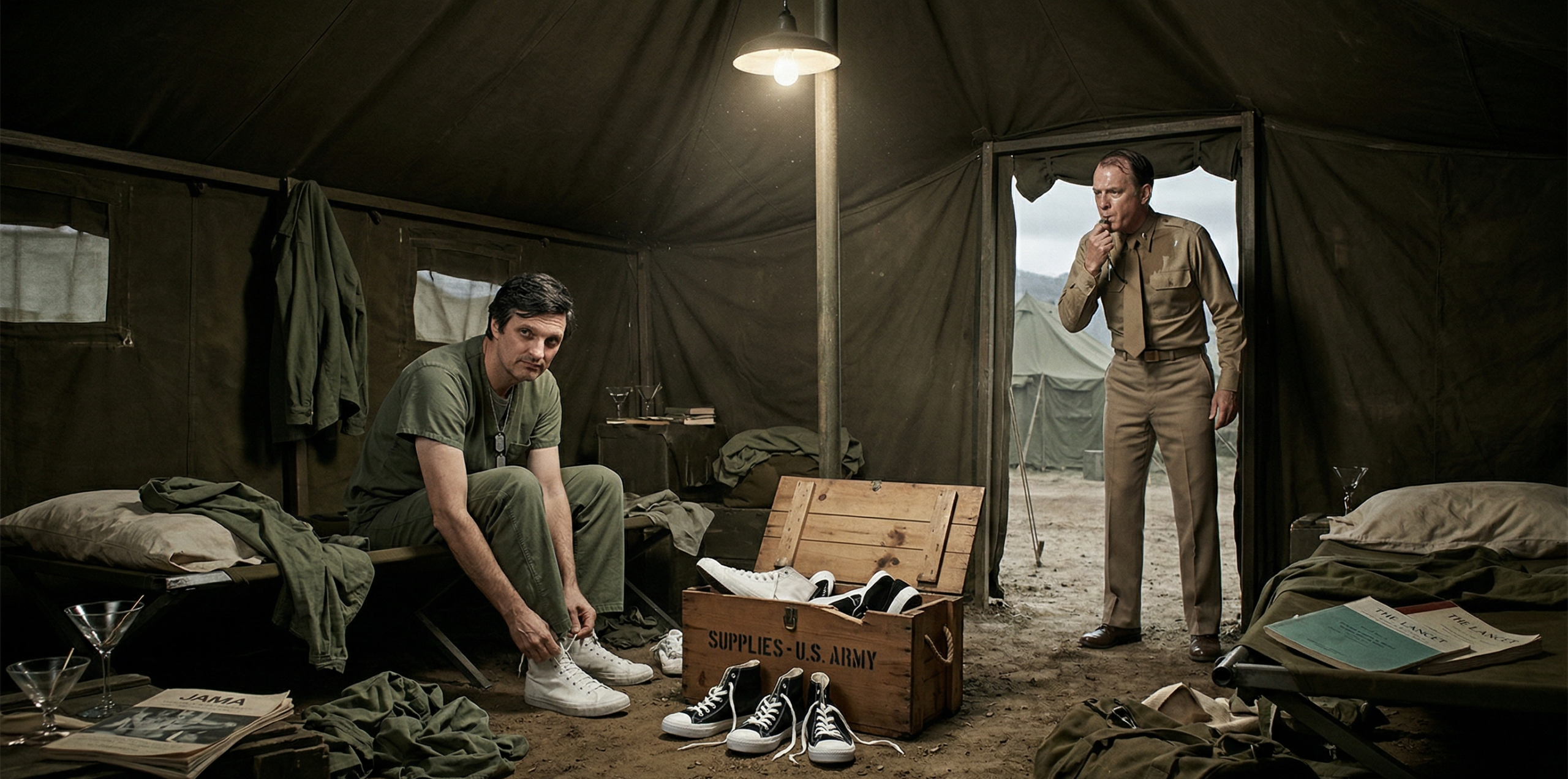 “Frank, unless you want to find yourself acting as a human speedbump for the next ambulance, I suggest you lower your voice and your blood pressure,” Hawkeye Pierce said, not even bothering to look up as he pulled the cotton lace of his newly acquired, glaringly white canvas sneaker.