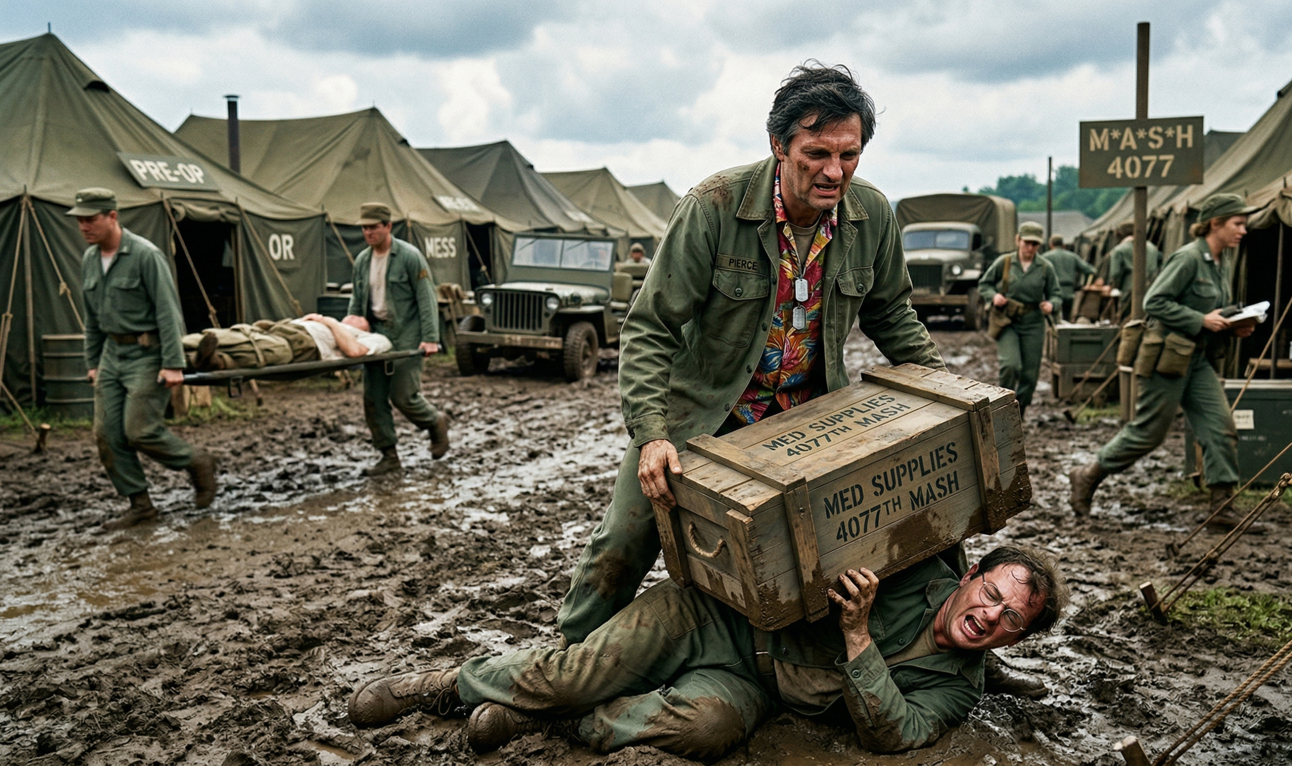 “I can’t! I’m fine, Captain Pierce, really, I’ll just slide out!” Radar squeaked, his round face pale beneath a fresh layer of Korean mud. He squirmed like a trapped badger, prioritizing the concealment of his left arm over his own physical safety.