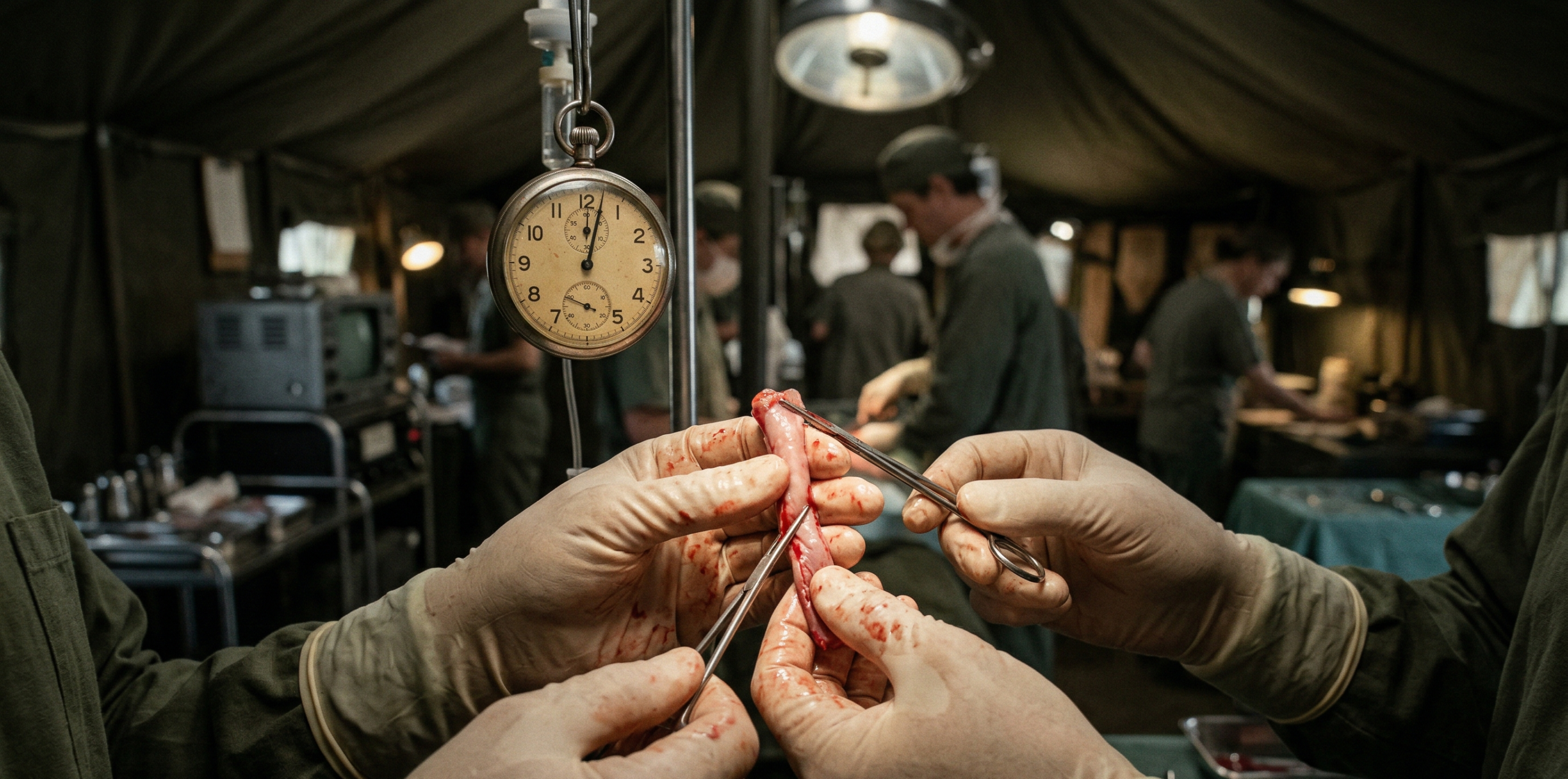 “Four and a half minutes to sew a microscopic seam in a slippery, blood-soaked tube,” Hawkeye muttered. “Child’s play. I usually do this blindfolded while singing ‘Toot Toot Tootsie’.”