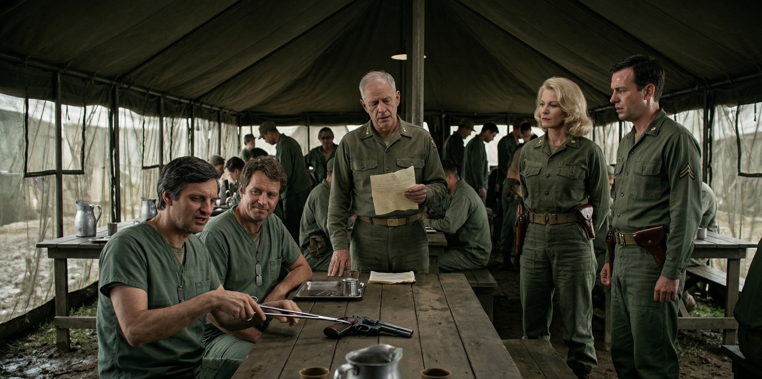 Just then, the tent flaps flew open. Major Frank Burns stood there, his own holster polished to a mirror shine, his eyes sweeping the room. “Alright, Pierce. I want to see it. I want to see your weapon properly secured in a regulation holster on your person.”