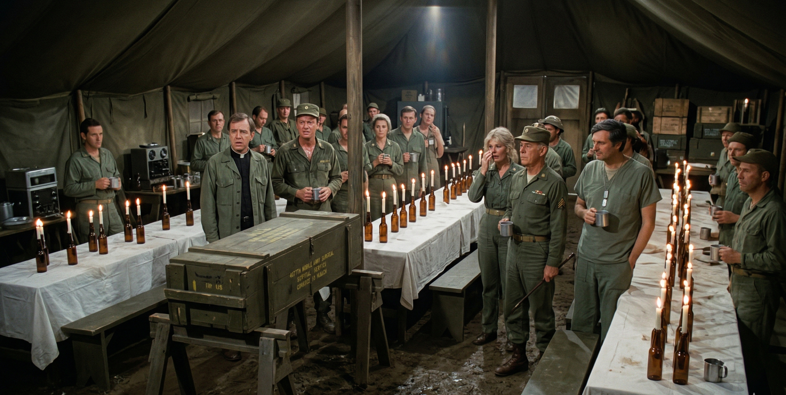 “Hawkeye, I have to protest,” Father Mulcahy said, wringing his hands as he surveyed the blasphemous scene. “Holding a wake for a living man… it’s highly unorthodox. The Bishop would have my collar!”