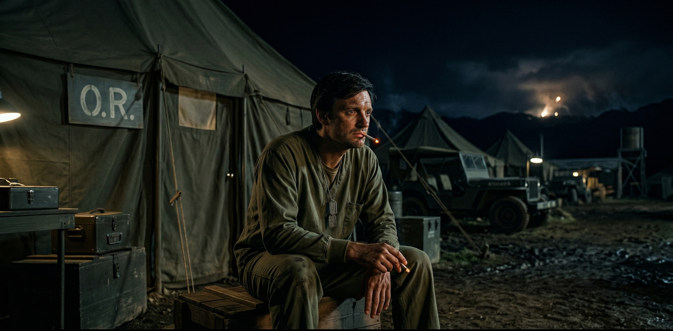 Hawkeye sat outside his tent, the Swamp, a half-empty glass of martinis resting on his knee. The night air was freezing, biting through his thin jacket, but he didn’t care. He stared out into the dark hills, where the distant, muffled thuds of artillery fire rolled like thunder.
