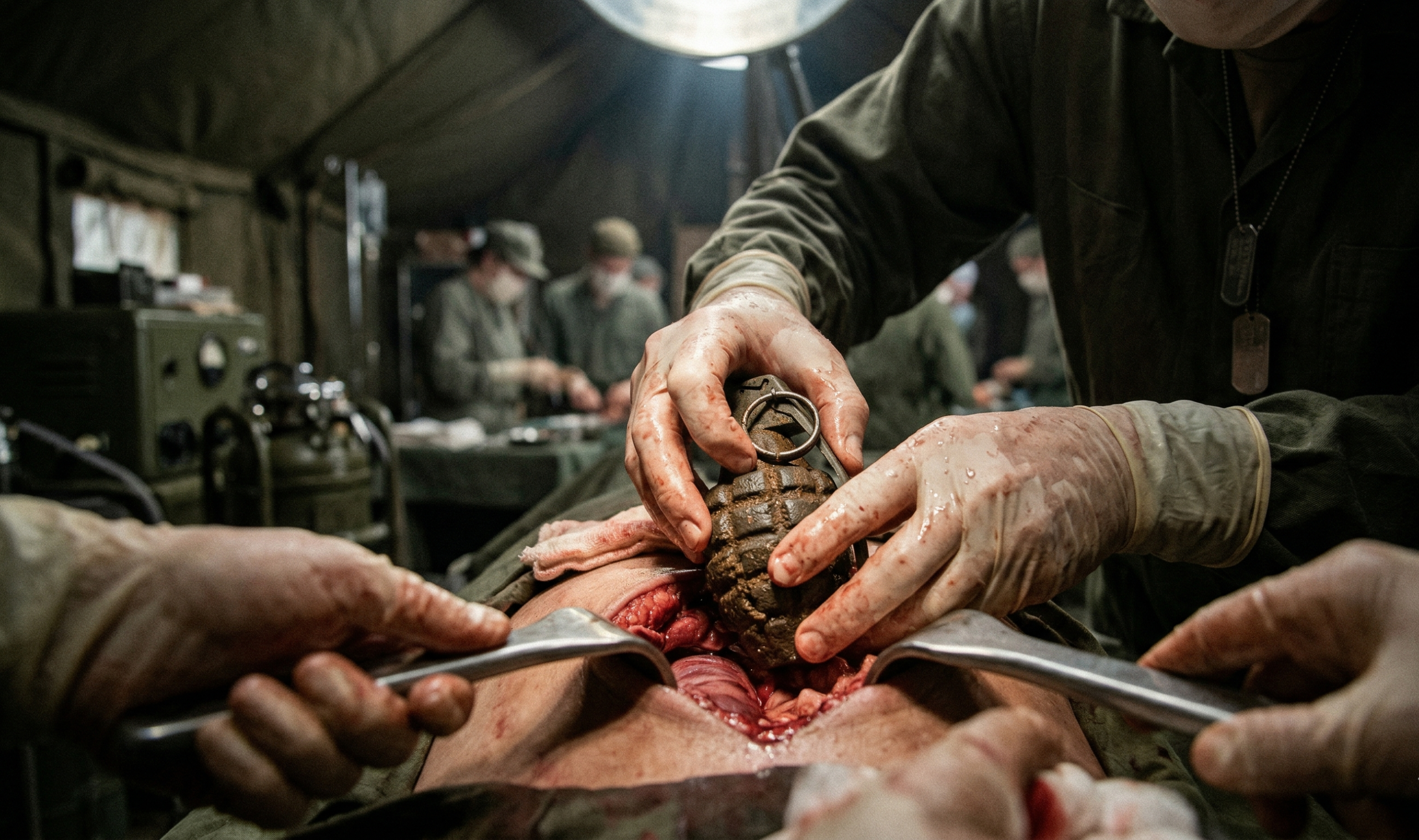 Hawkeye lifted. Millimeter by agonizing millimeter. The grenade was slick with blood, making his latex gloves slip. He tightened his grip, praying to whatever deity watched over foolish surgeons in warzones. The metal cleared the intestines. It cleared the shattered ribs.