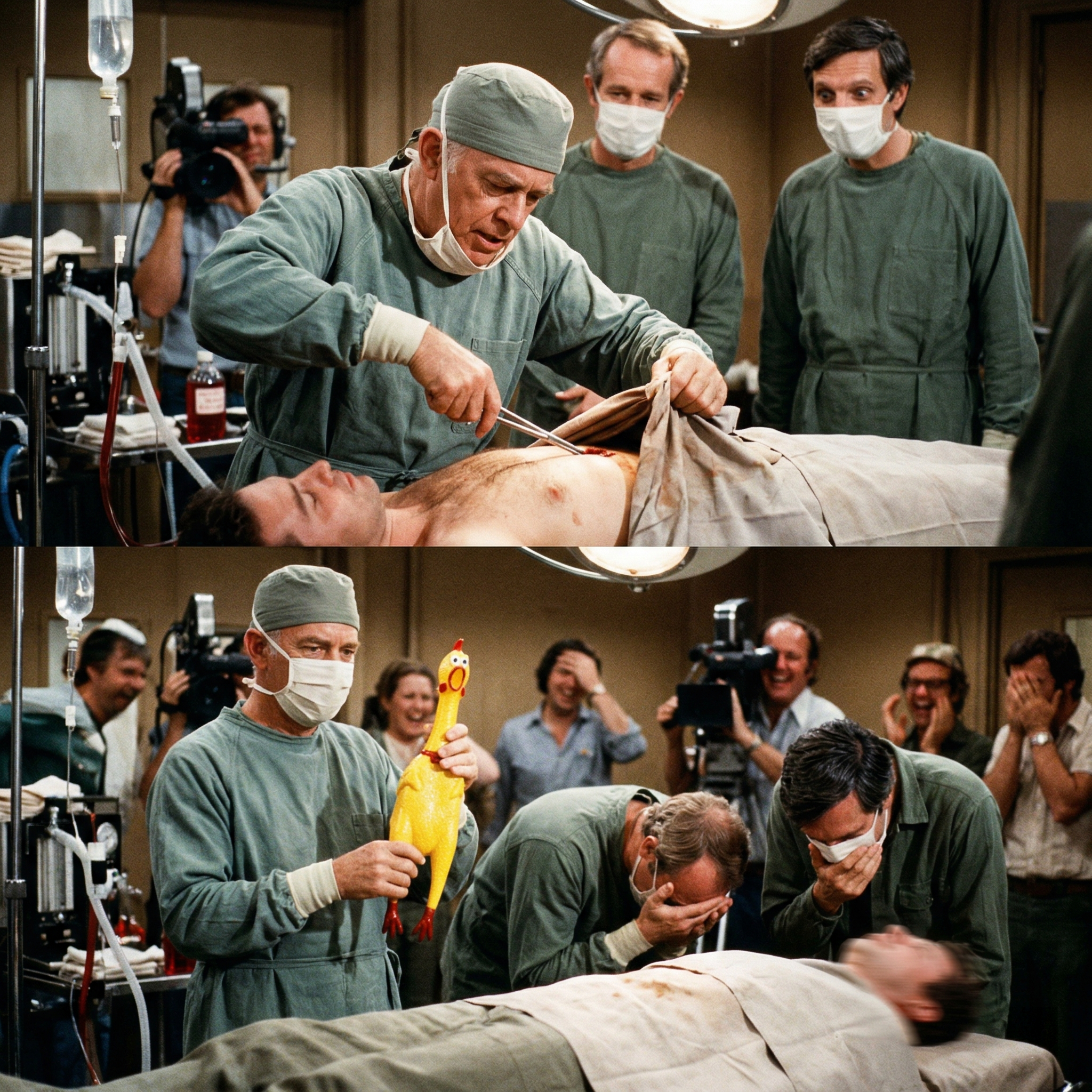 He held that chicken up to the surgical light, turned it slightly as if inspecting a tumor, and then, without breaking character for even a millisecond, he looked at me and said, “Gentlemen, I think I’ve found the cause of the patient’s fowl mood.”
