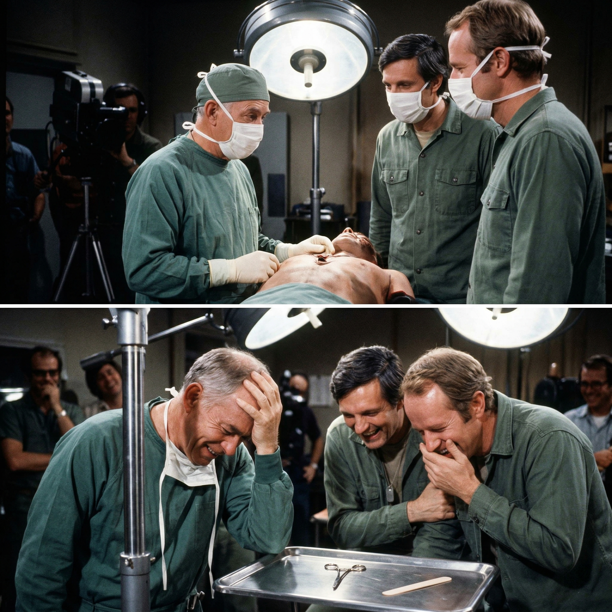 Next to him, Alan Alda and Mike Farrell are in similar states of total physical collapse, leaning on each other for support.