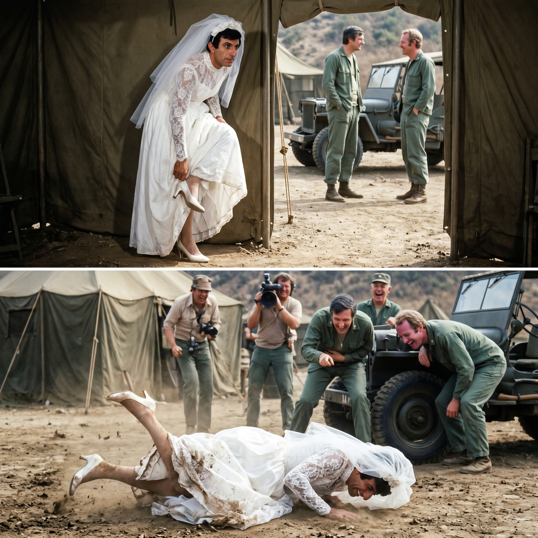 Mike Farrell walked over, looking down at the wreckage of the dress and the man inside it, and without missing a beat, he leaned down and asked if the bride was reconsidering her vows.