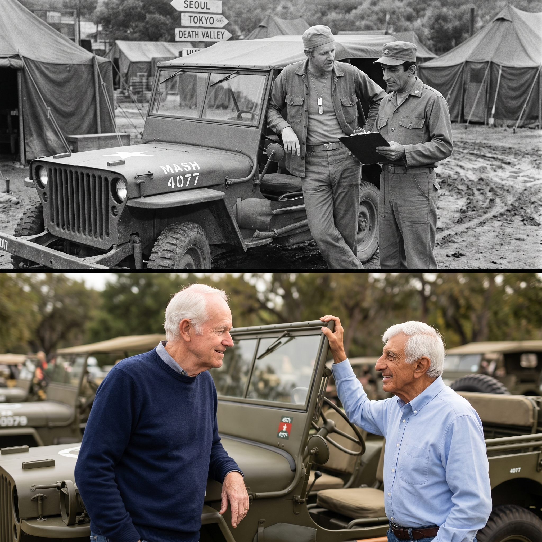 Beside him, Jamie Farr adjusted his cap, squinting against the sharp glare of the afternoon.