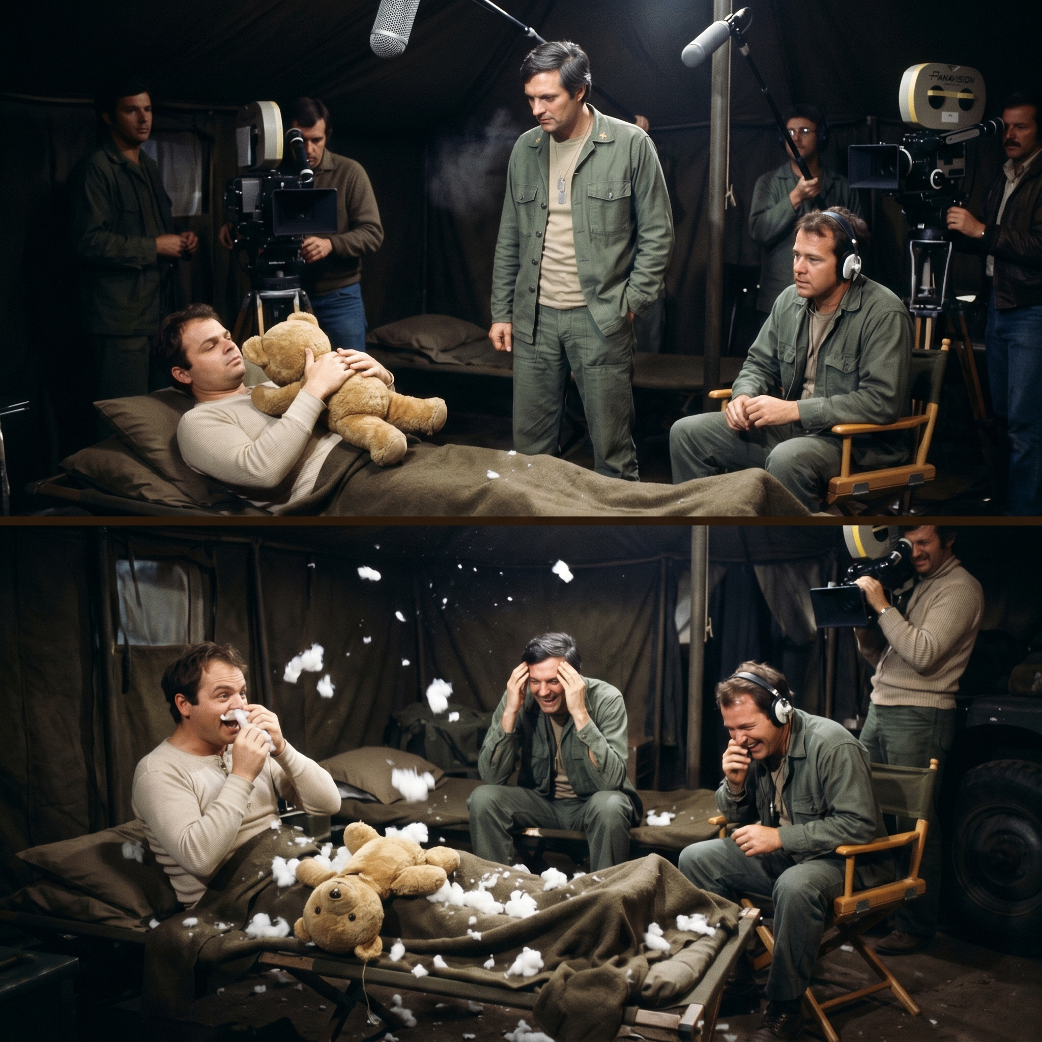 Alan Alda, who had been standing at the entrance of the tent ready for his cue, stumbled into the frame and sat on the edge of the cot.
