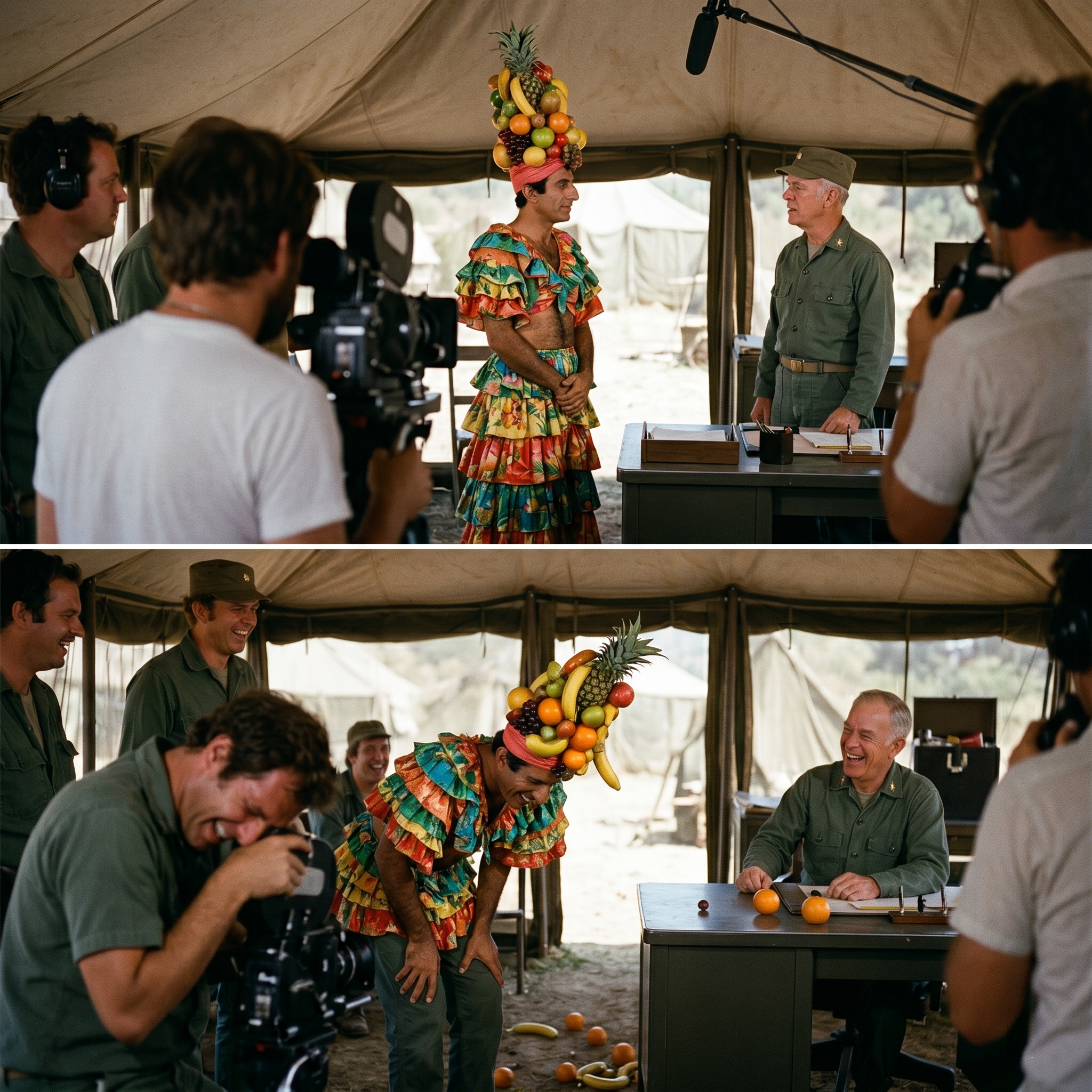 The scene involved a serious briefing with the Colonel, and I had to stand there, perfectly still, as if wearing a three-foot-tall pineapple arrangement was the most natural thing in the world.