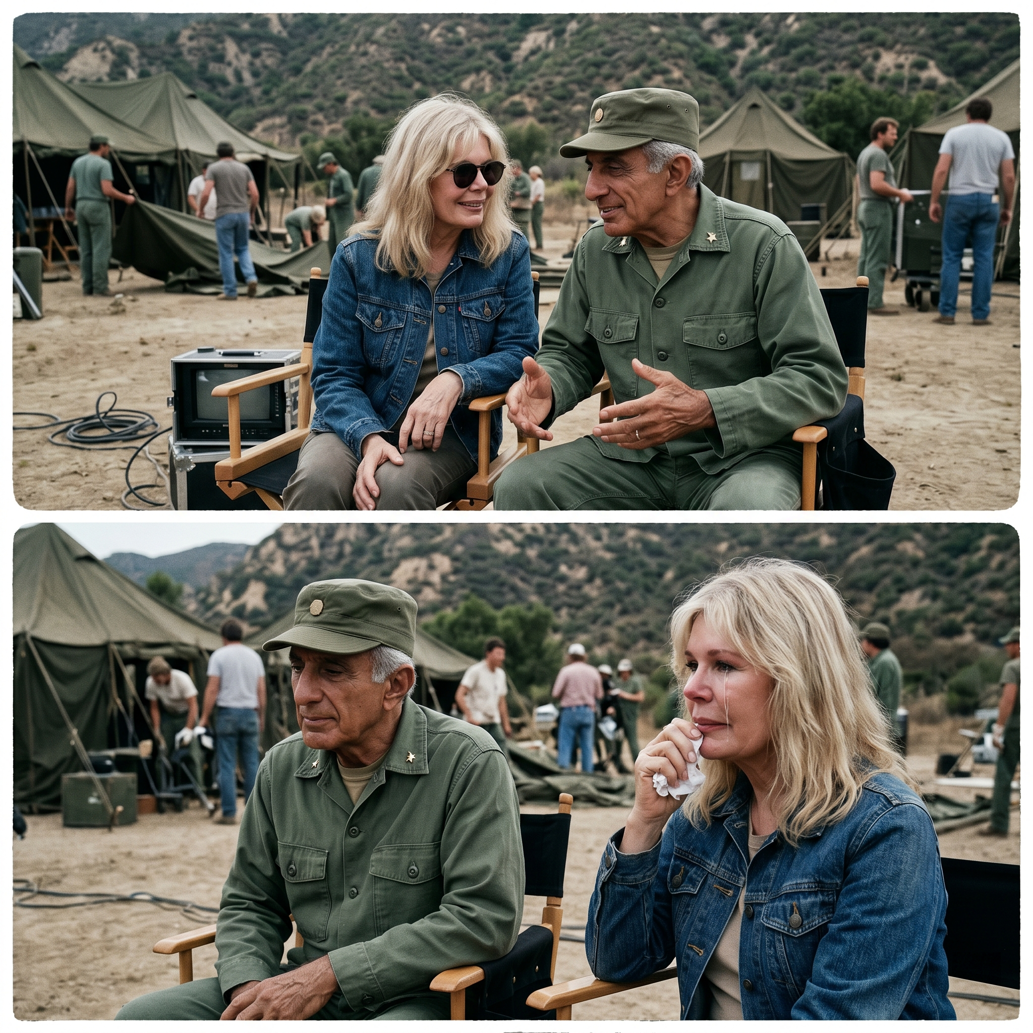 Loretta Swit sat on a folding chair, her eyes shielded by dark sunglasses, watching the crew coil cables and dismantle the familiar olive-drab tents of the 4077th.