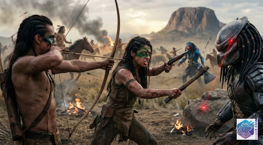 The valley falls as the towering hunters unleash their advanced weaponry upon the gathered tribes. Fierce warriors, fighting to defend the land their fathers bled for, find their flint and arrows struggling against the sheer, overwhelming armor of the alien strike force. “Unprecedented celestial anomalies reported over the frontier as native tribes face an unknown, heavily armed adversary.” The air grows thick with plasma burns and dust as the unnatural beasts dive from the treeline, turning the sacred hunting grounds into a frantic, bloody feeding ground.