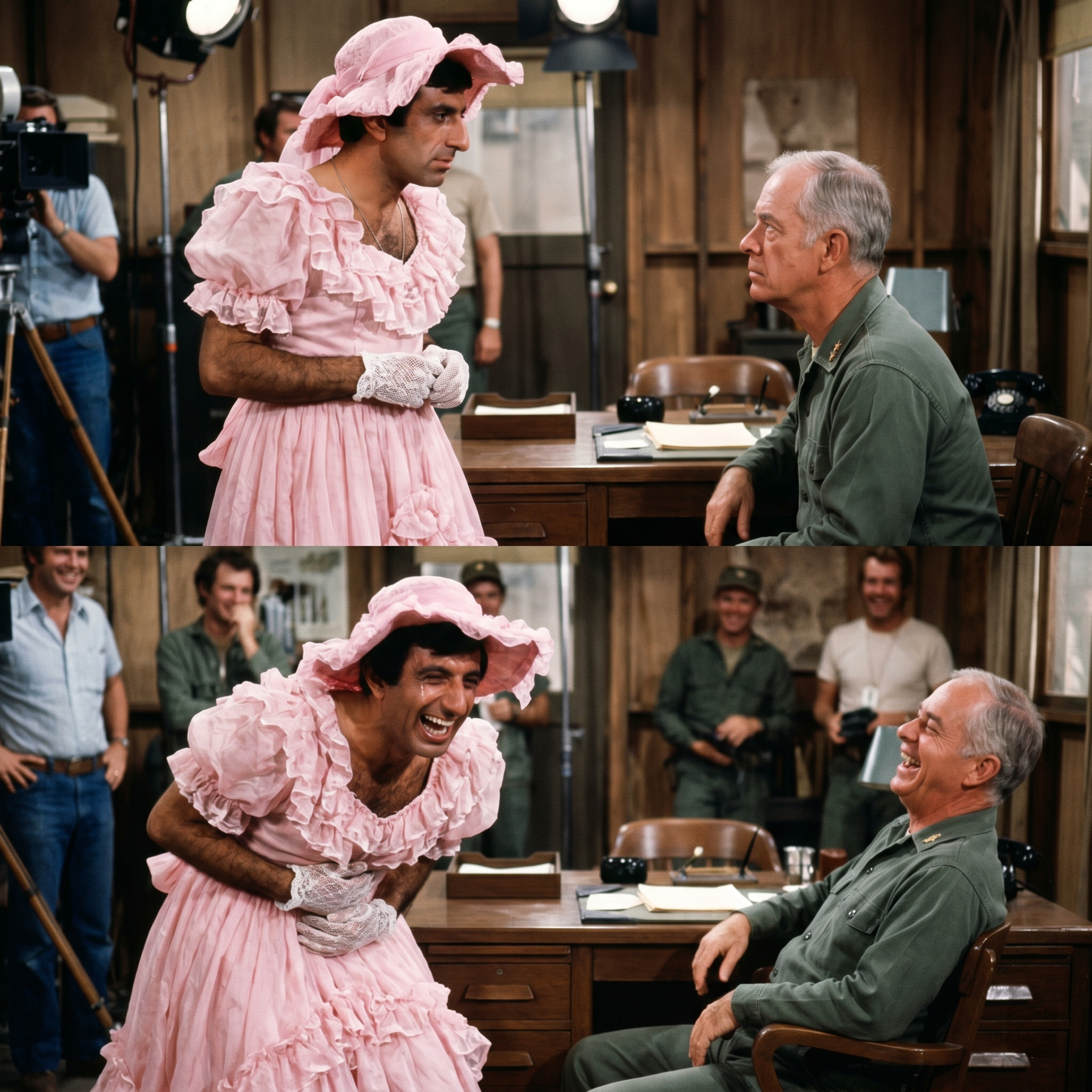 By the fourth take, Mike Farrell and Alan Alda had wandered over from the mess tent to see what all the commotion was about.