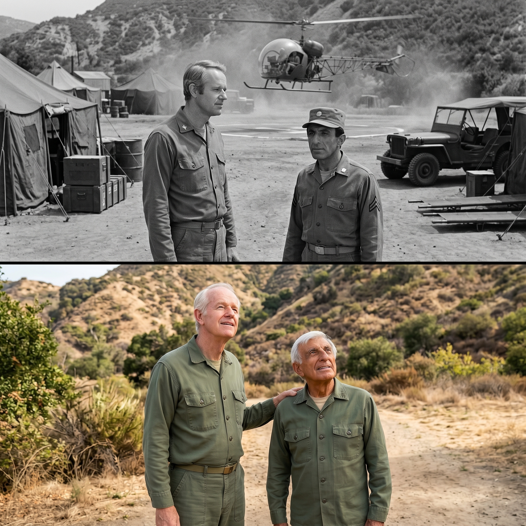Beside him, Jamie Farr adjusted his cap, his boots crunching against the same sun-baked gravel they had walked on nearly fifty years ago.