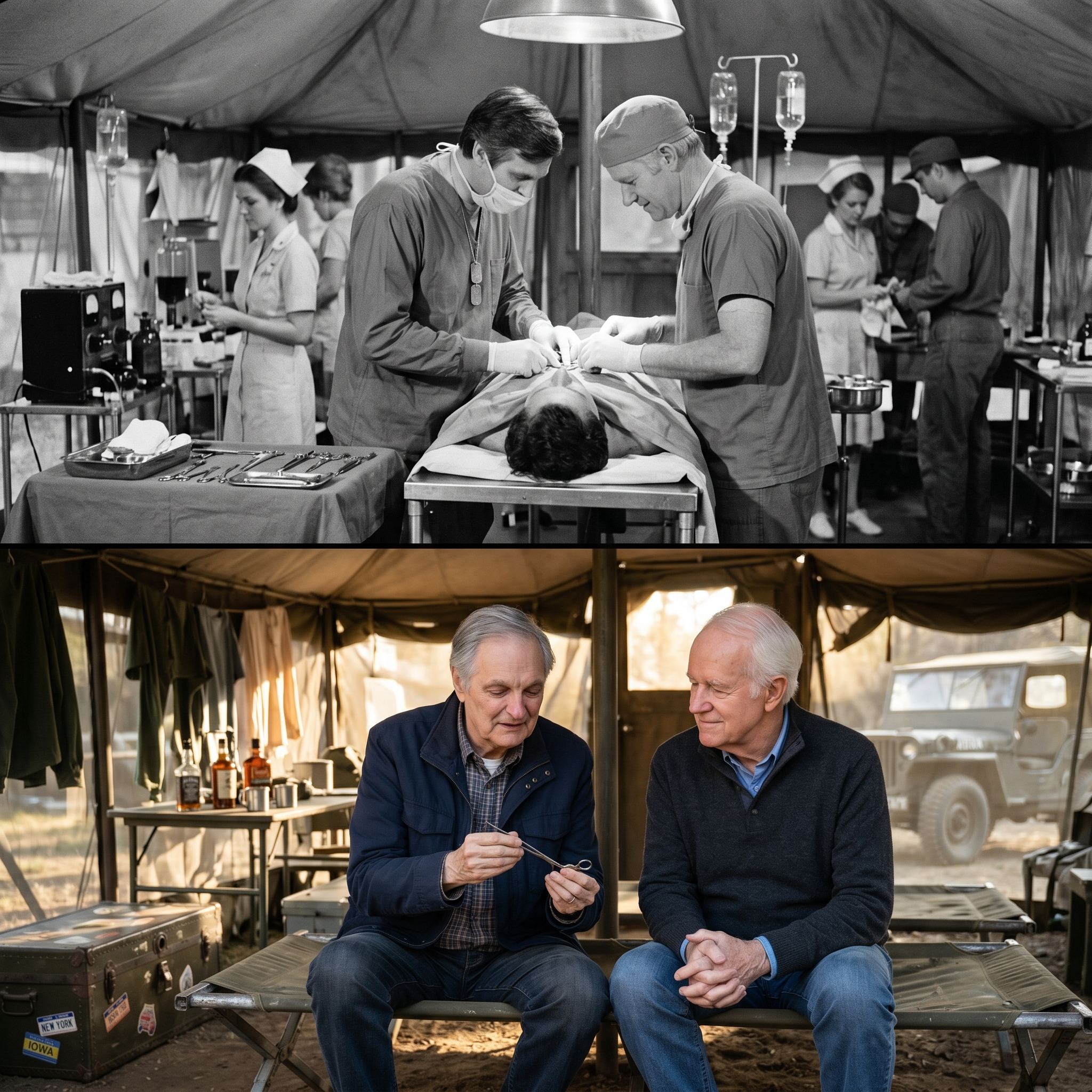 Jamie Farr walked through the rows of crates with Mike Farrell, their footsteps echoing against the concrete floor like a slow, rhythmic drum.