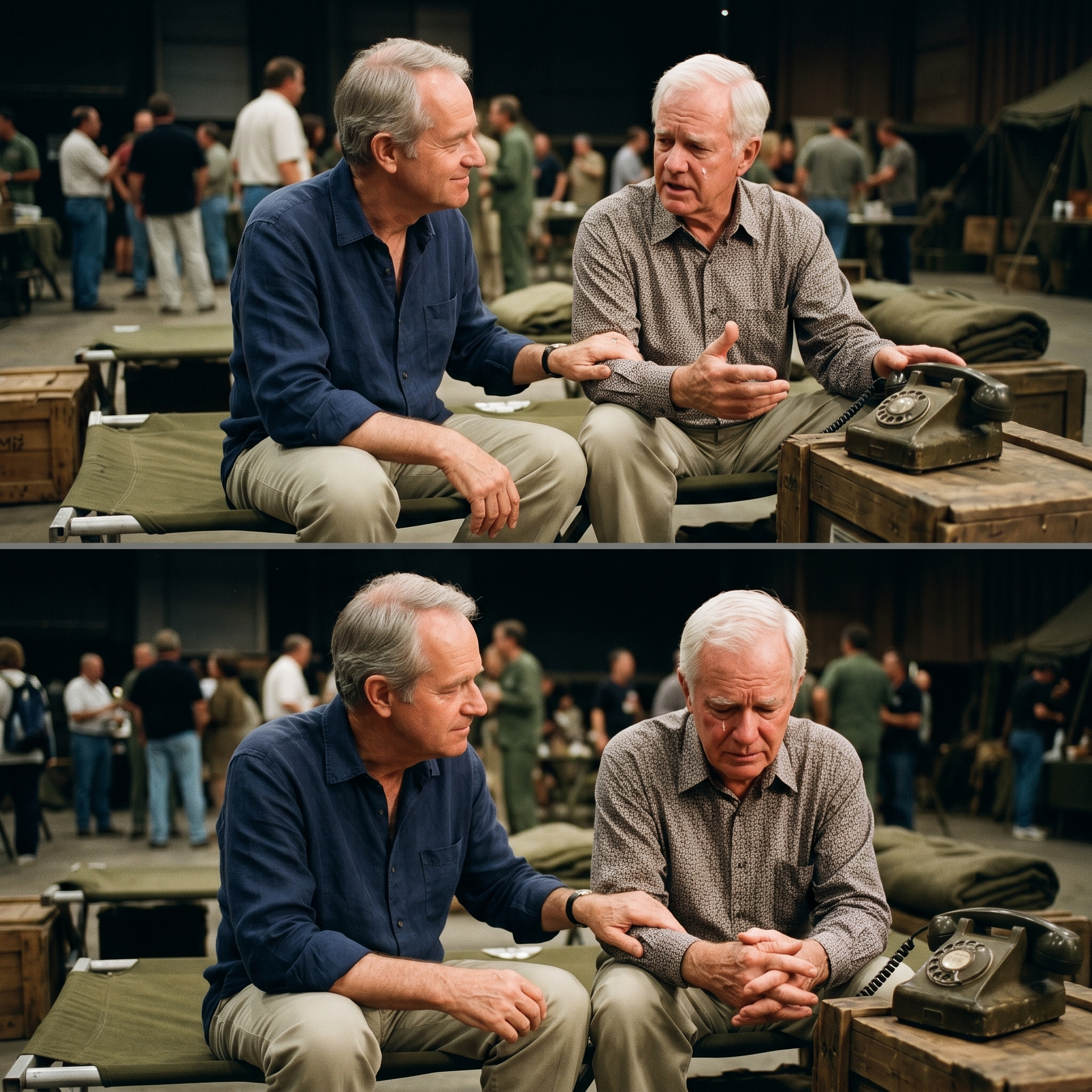 Across from him, Mike Farrell leaned against a bookshelf, watching his old friend with the same steady, supportive gaze he used to give him in the mess tent.