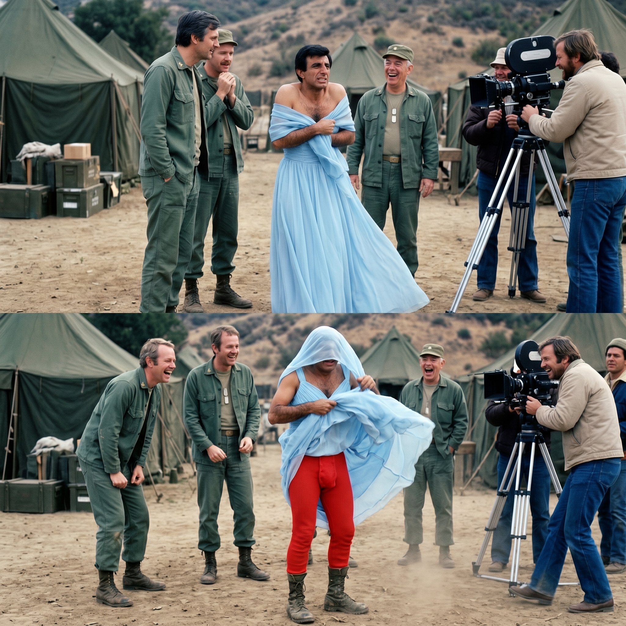 The script for this particular episode called for a warm spring scene, and his character was slated to wear a stunning, shoulder-less, baby-blue chiffon evening gown.