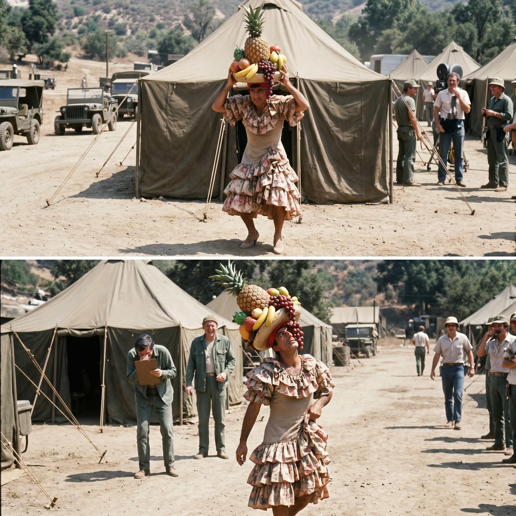 “I was standing behind one of the supply tents, trying to keep my balance in these ridiculous high heels that kept sinking three inches into the California dirt every time I shifted my weight. I could hear Alan Alda and the rest of the guys finishing a scene near the swamp. I was sweating through my makeup, feeling the weight of that produce section pressing into my skull.”
