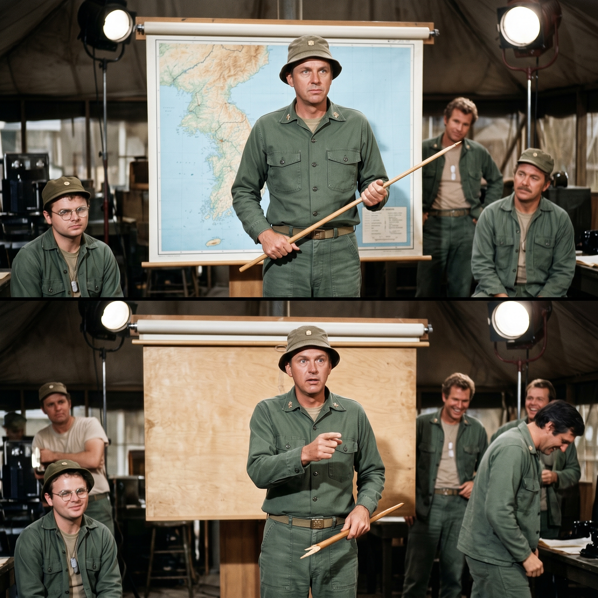 I didn’t move. I thought, maybe if I stay perfectly still, they can edit this. Or maybe Henry Blake is just so incompetent he doesn’t notice the map is gone. Then I heard it. It started with Alan Alda. He has this specific way of laughing where he tries to swallow it, and it sounds like a dying tea kettle.
