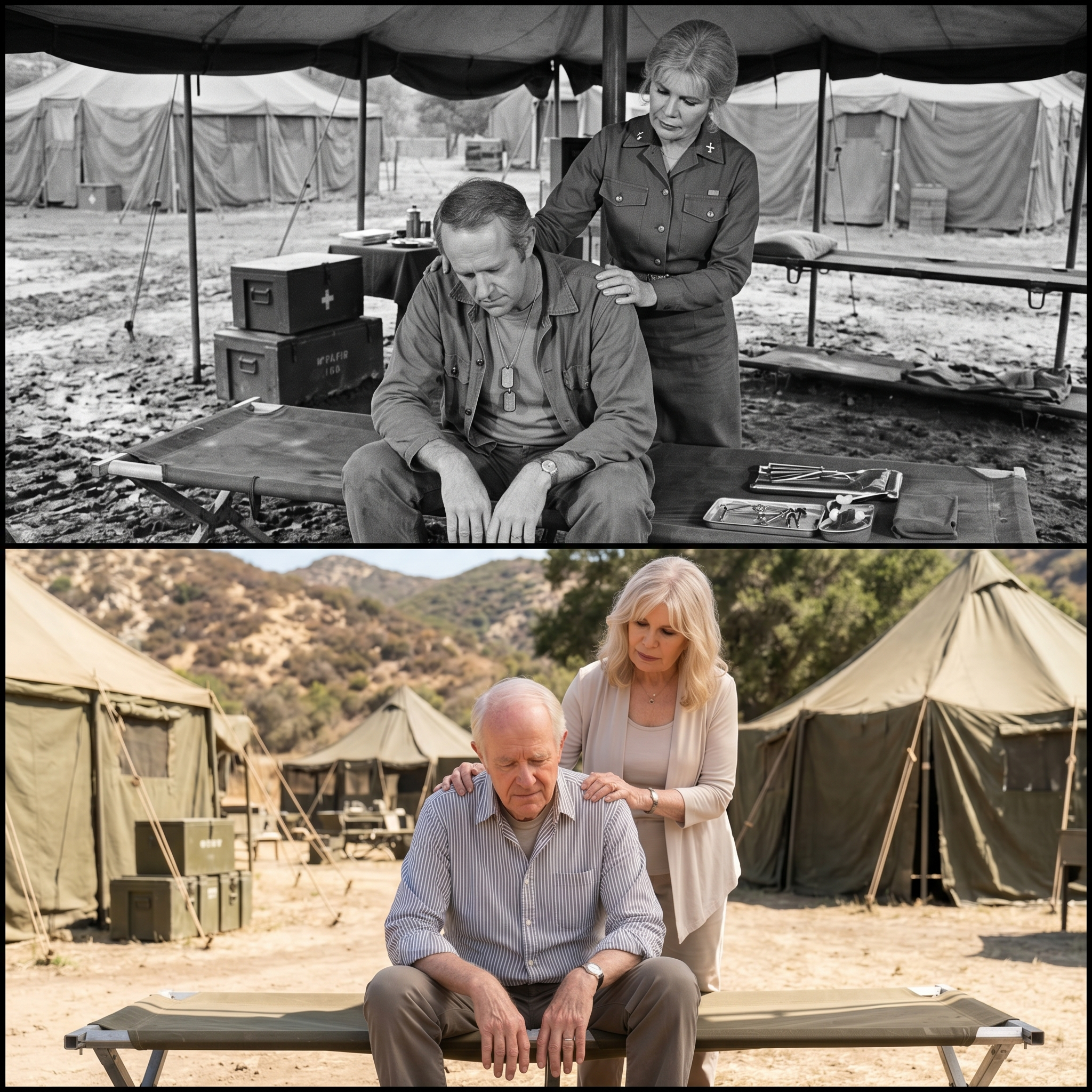 Beside him, Loretta Swit stood quietly, her hand resting on the rough wooden post of a reconstructed military tent.