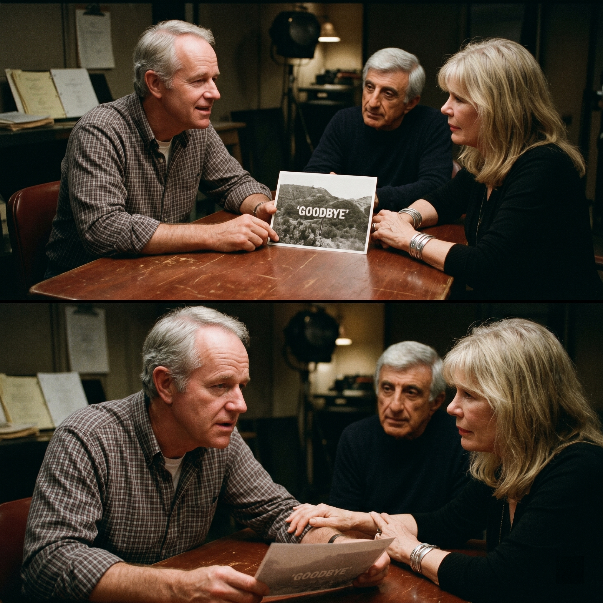 Across from him, Loretta Swit adjusted a silver bracelet on her wrist, her eyes fixed on a grainy photograph resting between them.