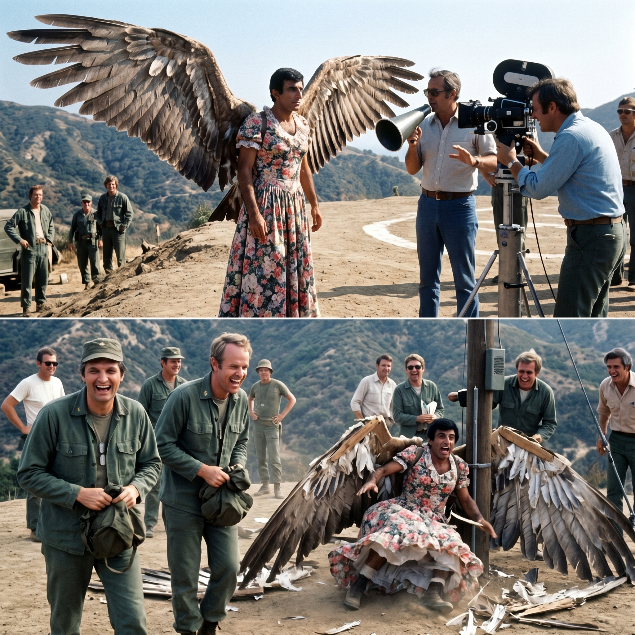 We were filming an episode where Klinger decides that if he can’t get a psychiatric discharge, he’ll simply fly away like a giant bird of prey.