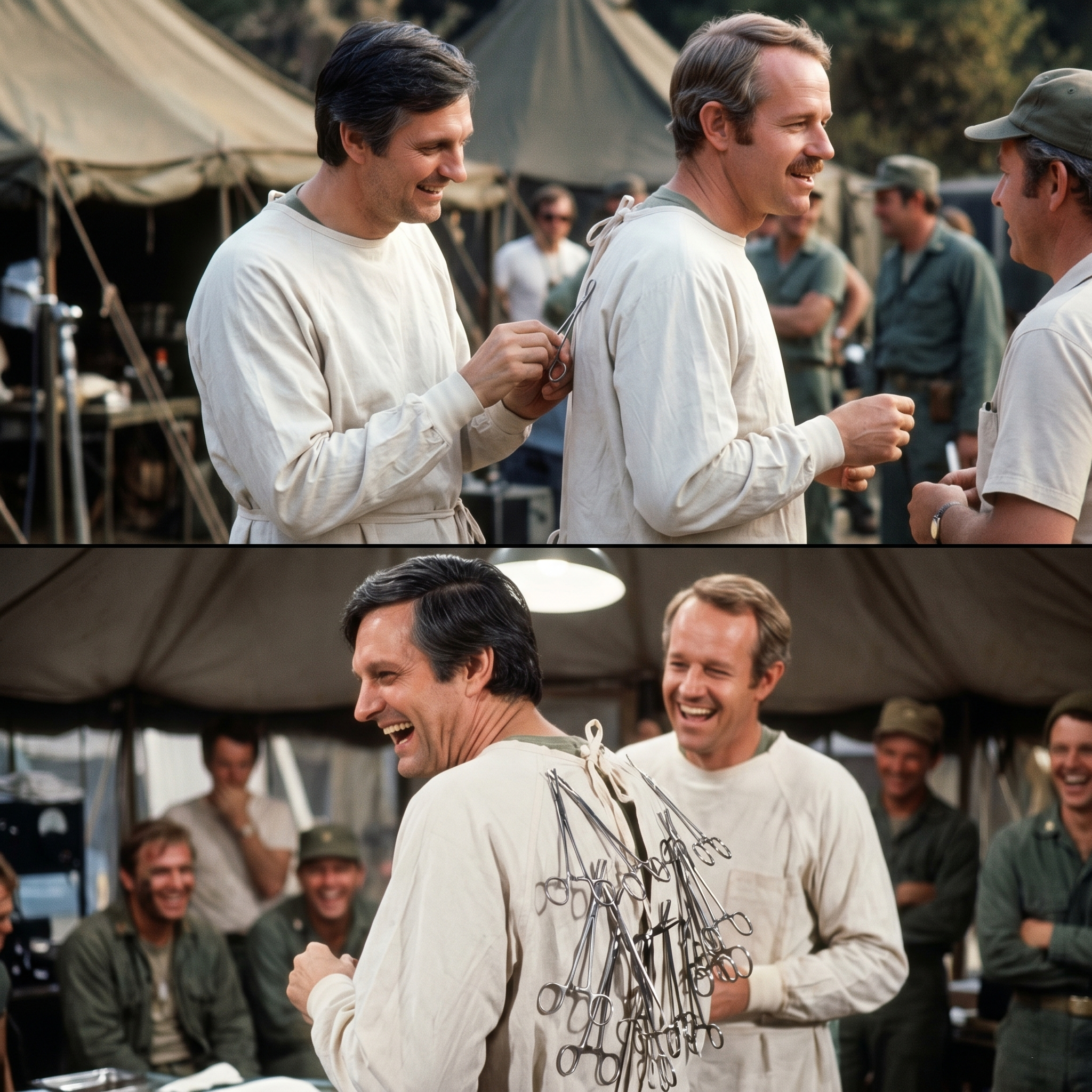 The rest of the guys—Alan Alda, Mike Farrell, Harry Morgan—were lounging near the mess tent in their standard Army gear, looking relatively comfortable while a makeup artist tried to stop my face from melting off.