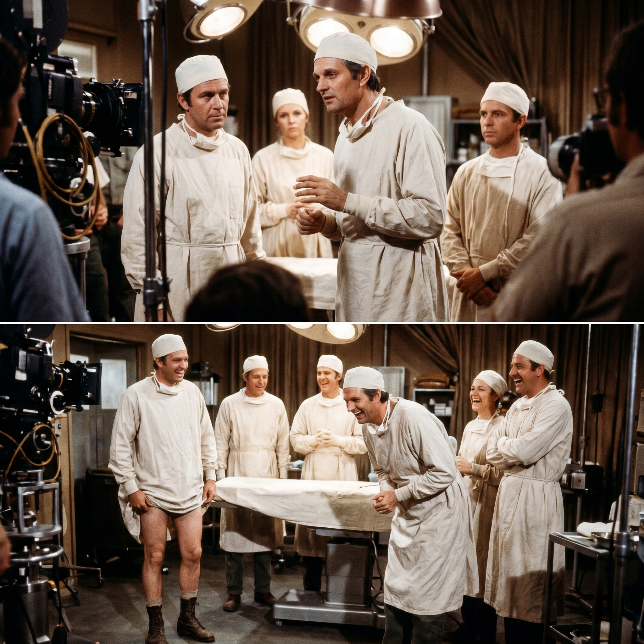 Because of the unbearable heat of the studio lights, and because the camera only ever framed them from the chest up while they were bent over the operating tables, the cast had made a collective, unspoken wardrobe decision.