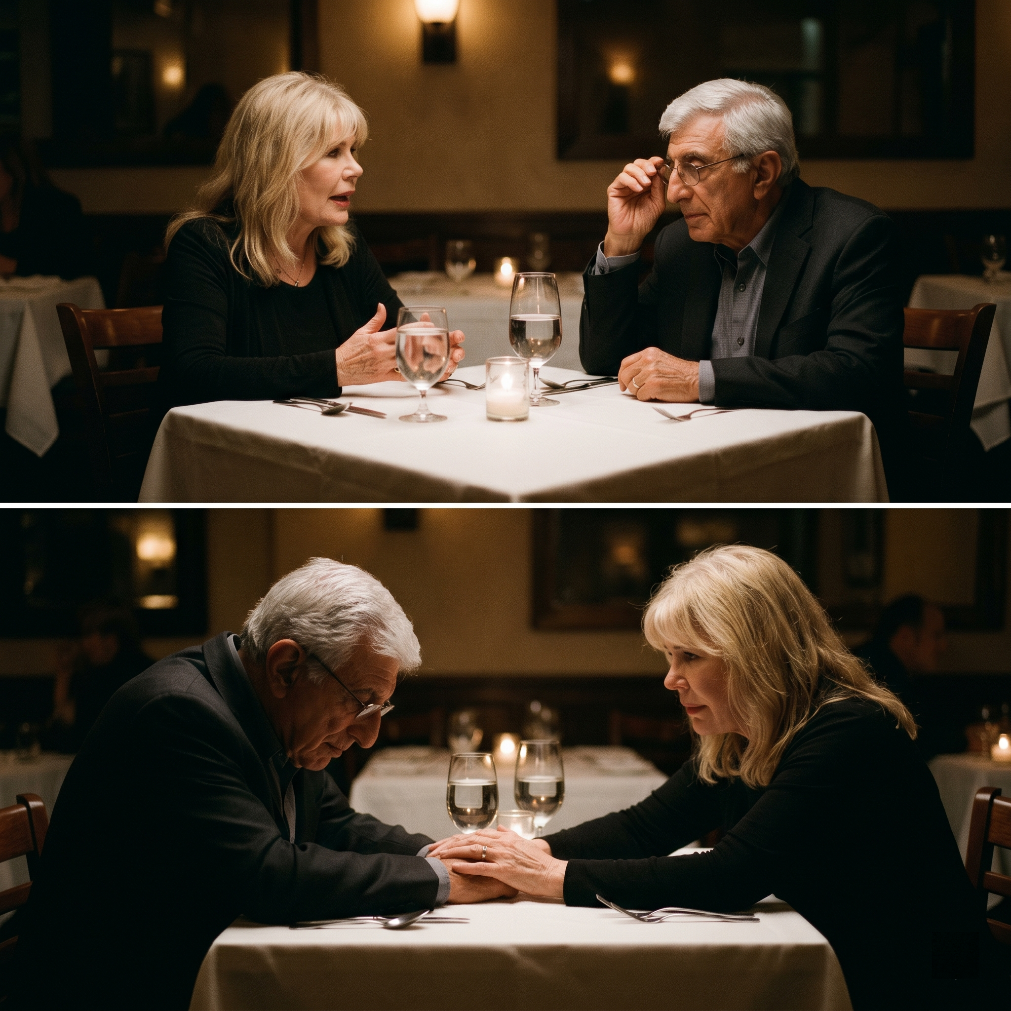 Jamie Farr sat across from Loretta Swit, the low amber light of the room catching the silver in their hair.