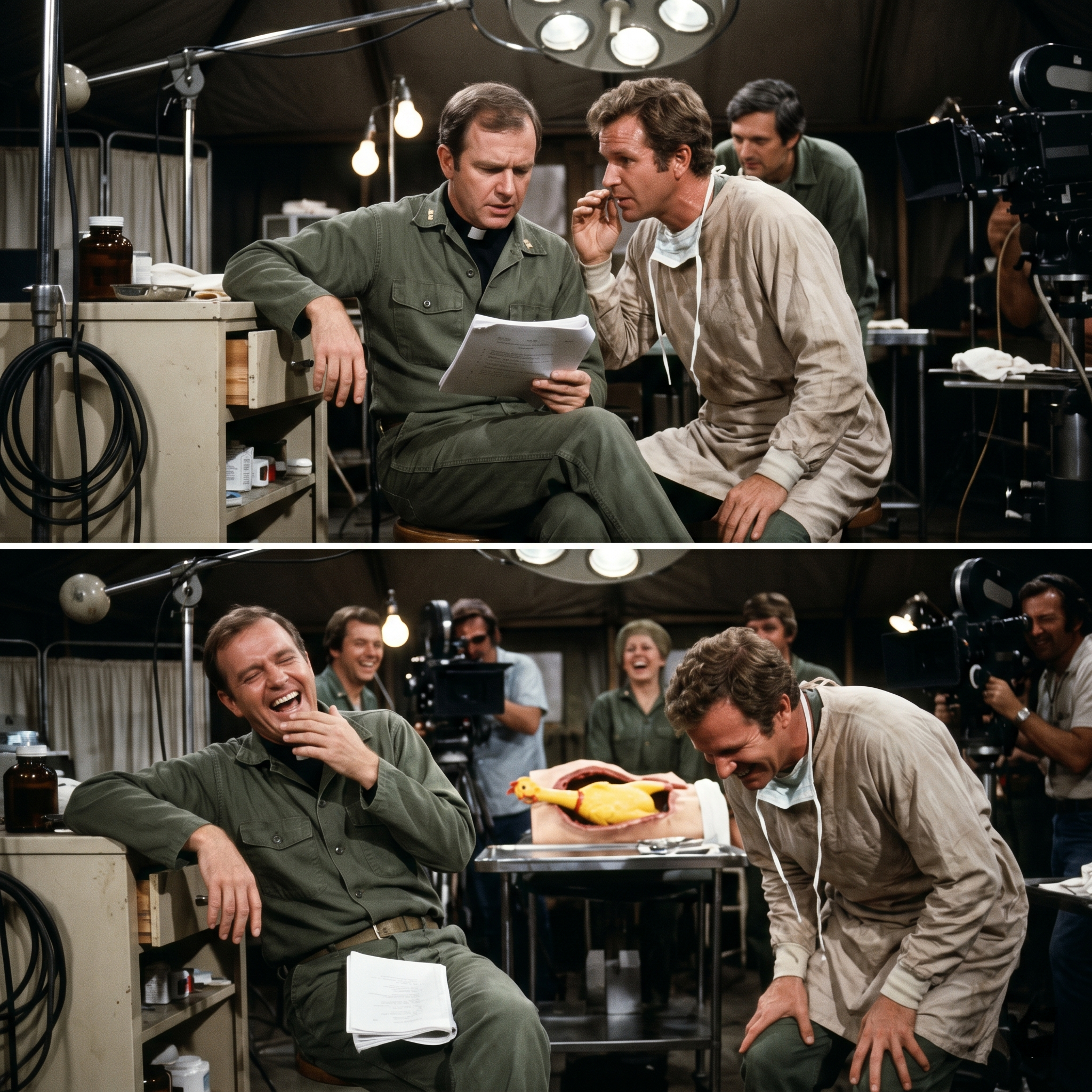 Now, the supposedly dead-serious medical scene featured two sobbing surgeons, a bouncing rubber chicken, and a giggling corpse.