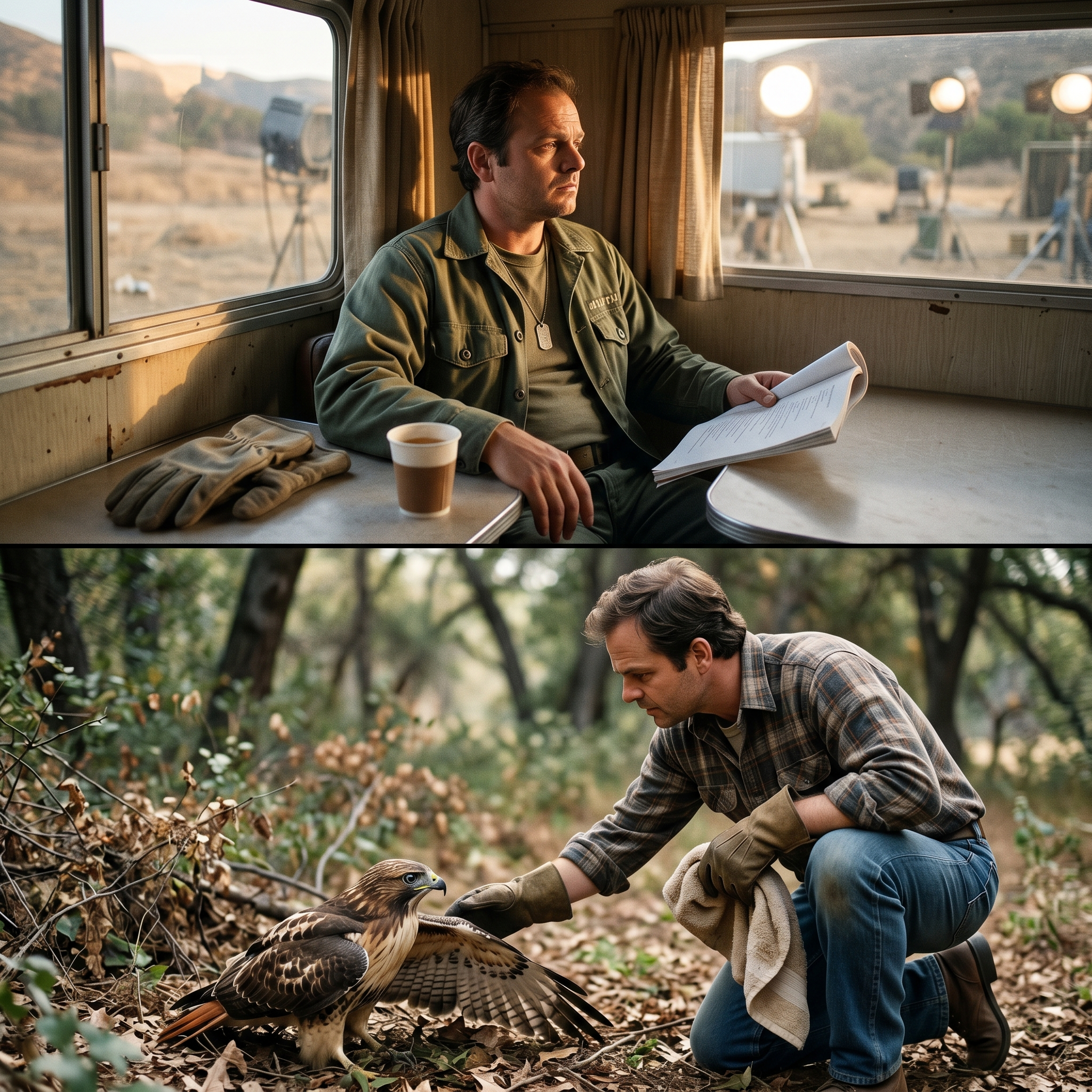 He found the bird near the edge of his property, a red-tailed hawk with a wing shattered by a collision or a predator. It was grounded, vulnerable, and fiercely angry. As he approached, the bird didn’t look at him with the adoration of a fan or the expectation of a director; it looked at him with the raw, terrifying honesty of nature. He didn’t reach for a camera or call an assistant. He reached for a pair of heavy gloves and a towel. In that moment, as he felt the frantic heartbeat of the hawk through the fabric, the noise of the number one show in America vanished. He wasn’t a star, and he wasn’t a corporal. He was just a human being holding a piece of the world that was actually, physically broken—and for the first time in years, he knew exactly what he had to do.