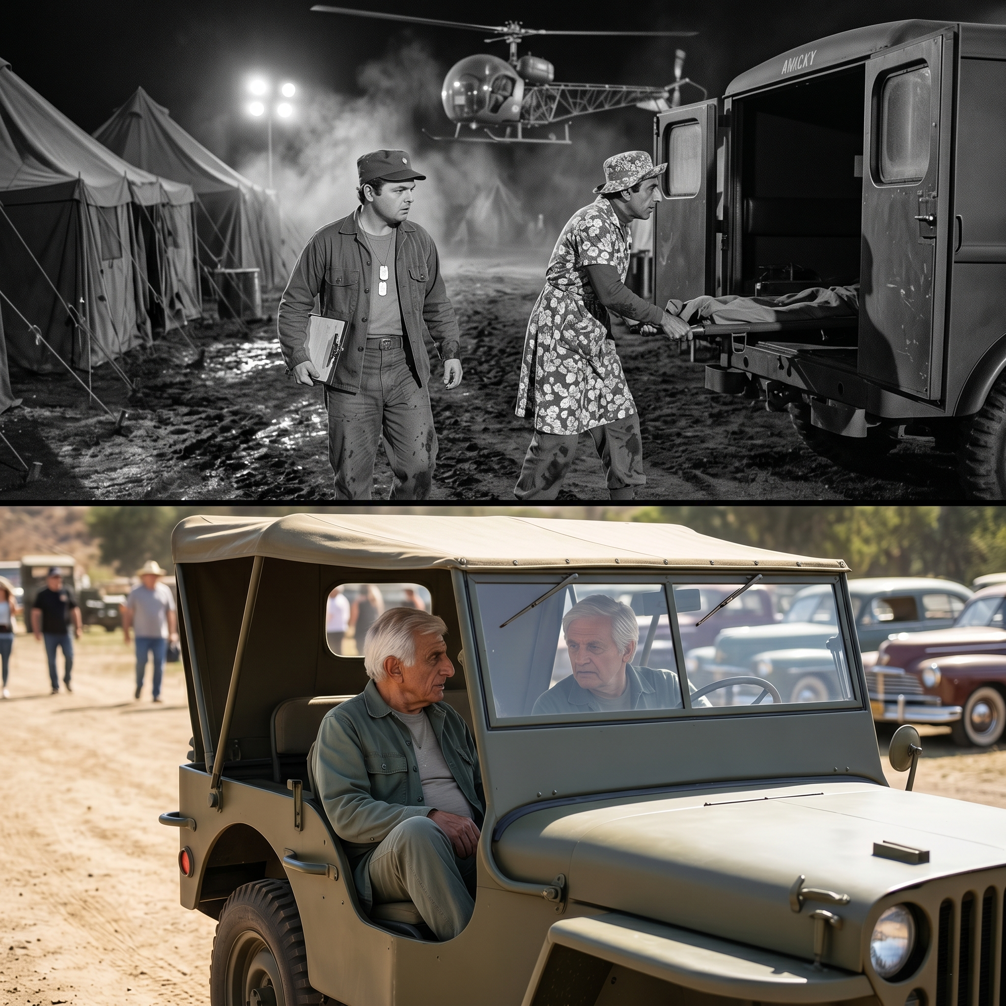 Gary Burghoff and Jamie Farr stood near the olive-green hood, trading quiet jokes.