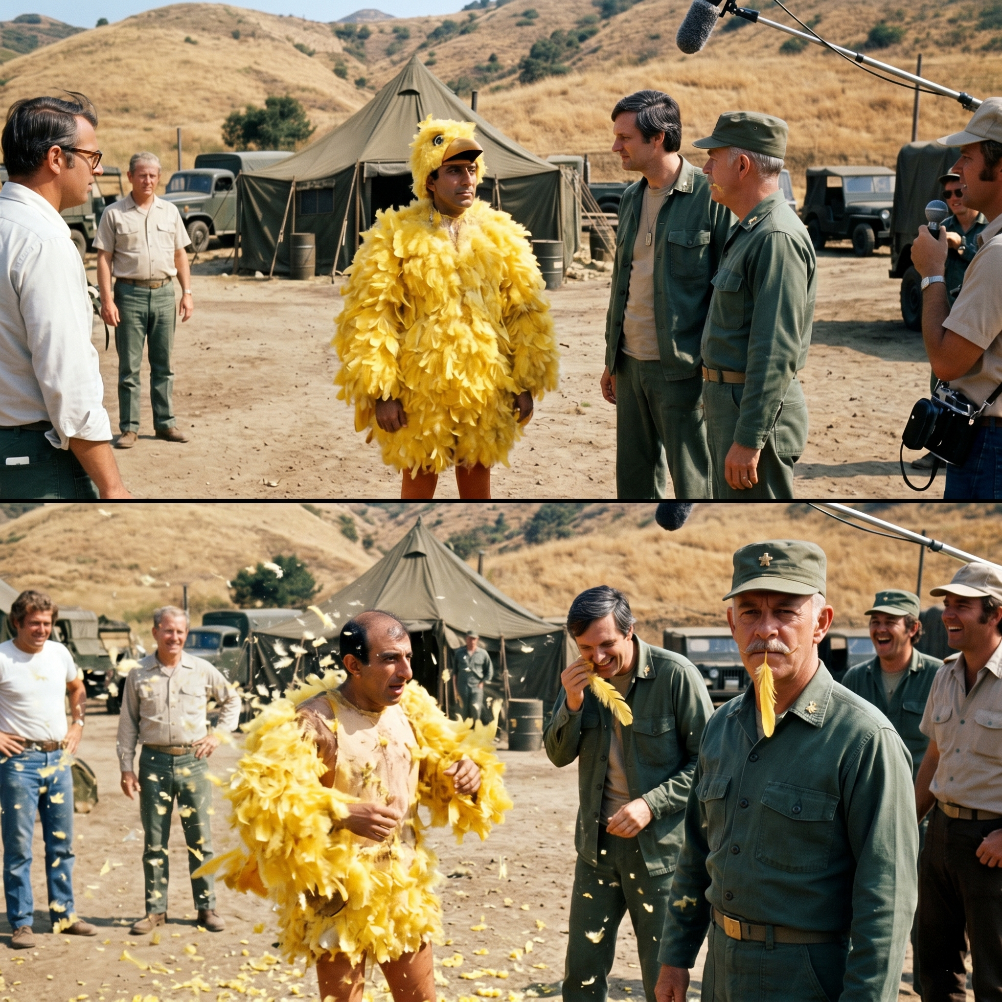 I remember sitting in that trailer, eating a tuna sandwich while three women pinned yellow feathers back onto my chest. That was the reality of being on MAS*H. One minute you’re part of a groundbreaking piece of television history, and the next, you’re a sixty-year-old man being glued back together like a craft project.