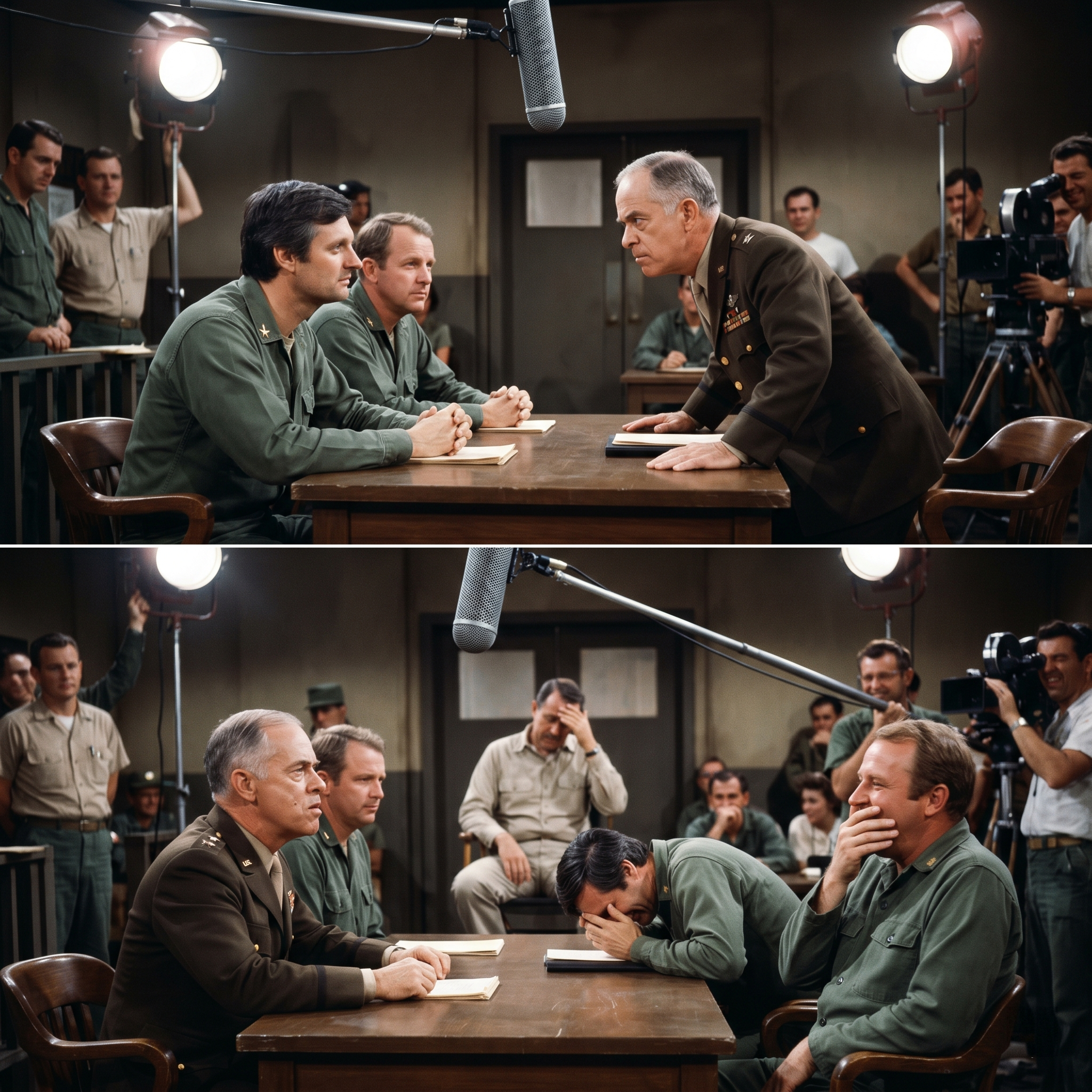 Alan, playing Hawkeye, and MacLean Stevenson, playing Colonel Blake, were seated across a long wooden table from Harry.