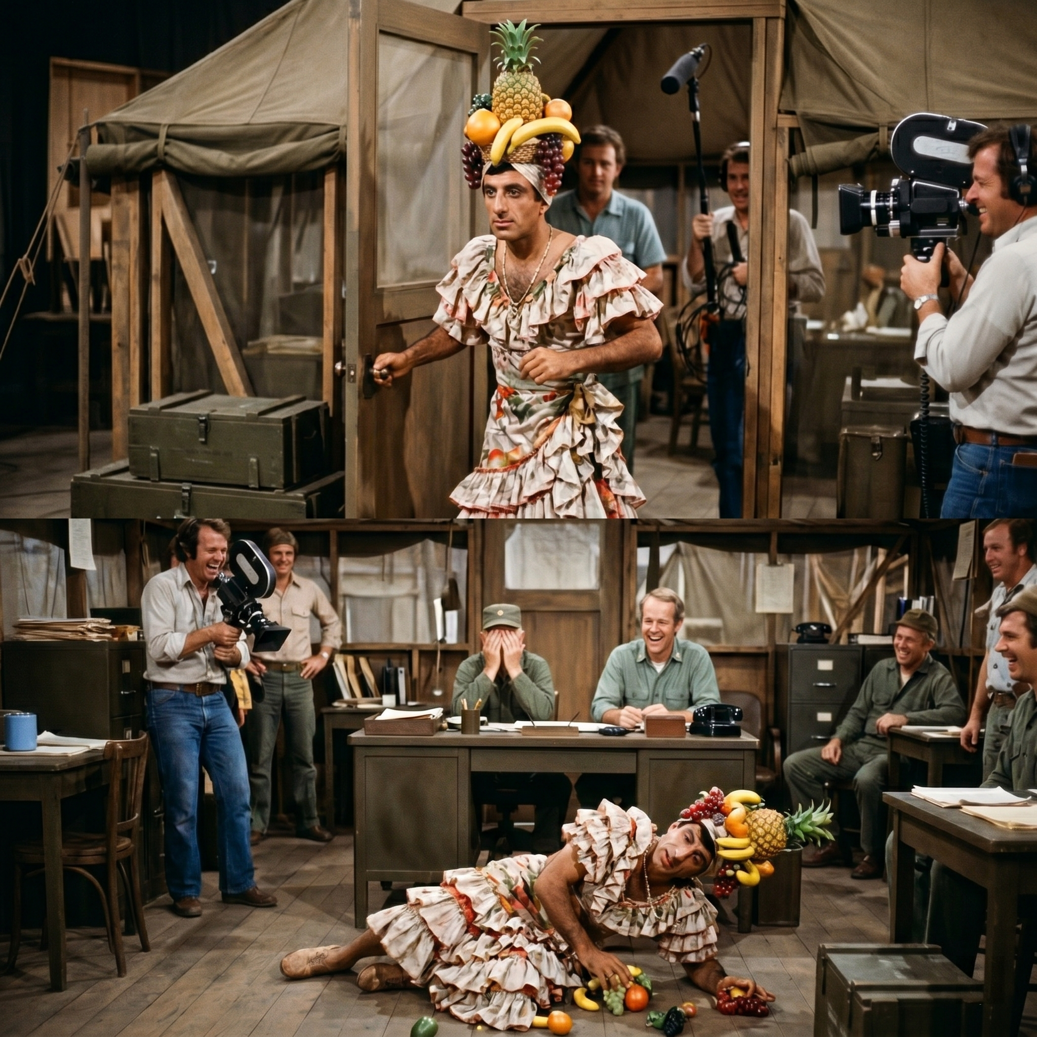 His co-stars, sitting behind the desk desperately trying to maintain their authoritative military postures, just stared at the fruit rolling across their paperwork.