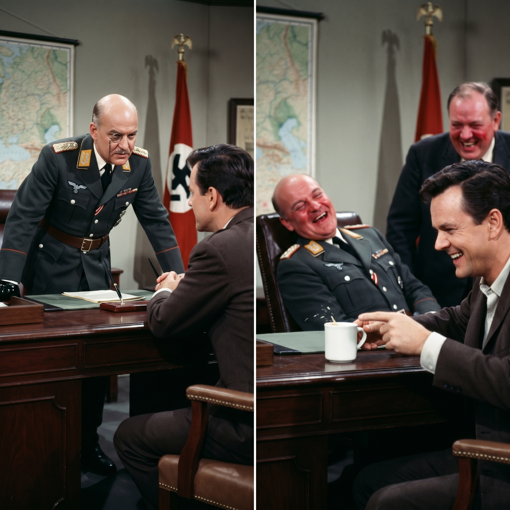 I tried to maintain that stiff, military posture, but then I caught a glimpse of John Banner—our dear Schultz—standing in the background by the door.