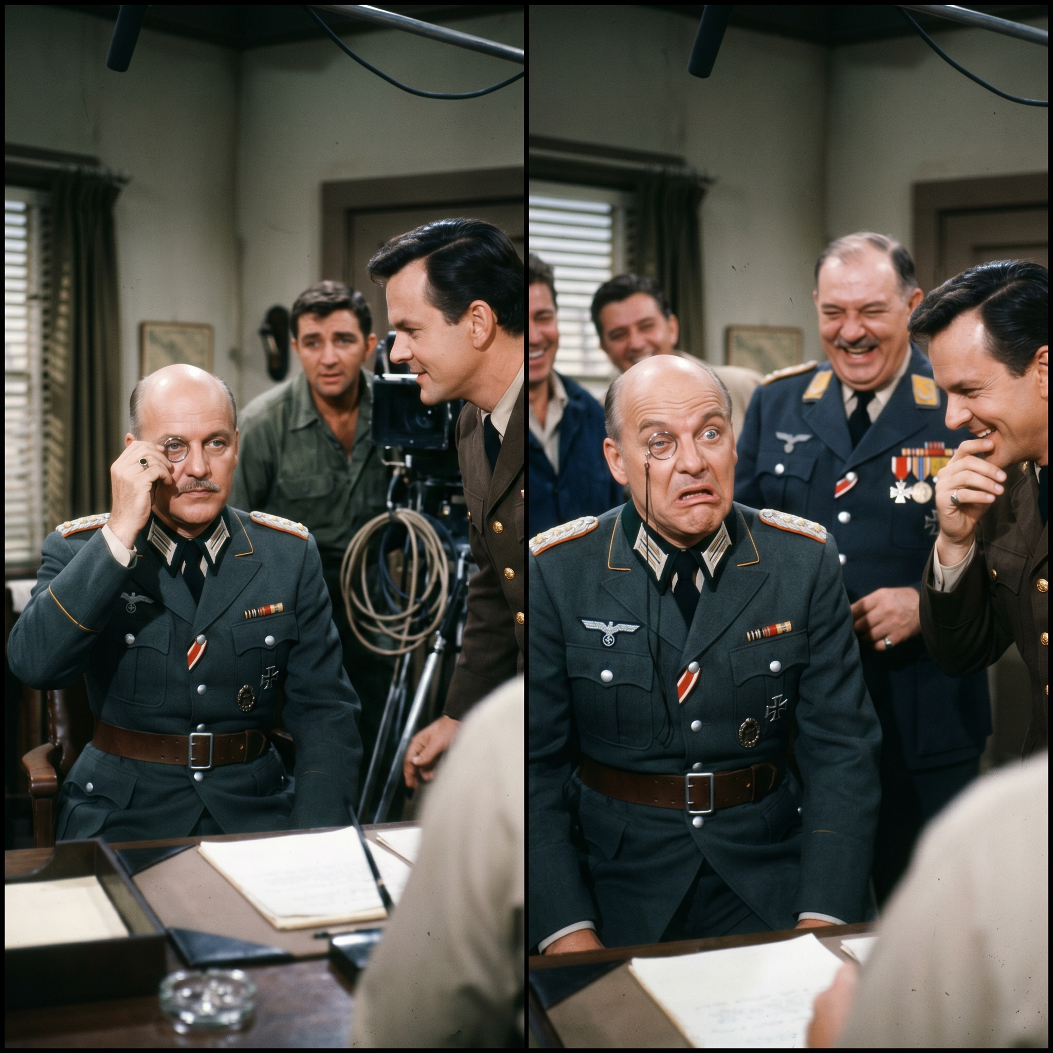 Werner’s eyelid was suddenly fused to the rim of the glass. He tried to blink, but his eye remained frozen in a wide, startled glare. He attempted to deliver his first line—”Hogan!”—but the tension of the adhesive pulled the corner of his mouth upward, giving him a bizarre, lopsided sneer that looked more like a stroke than a military reprimand.