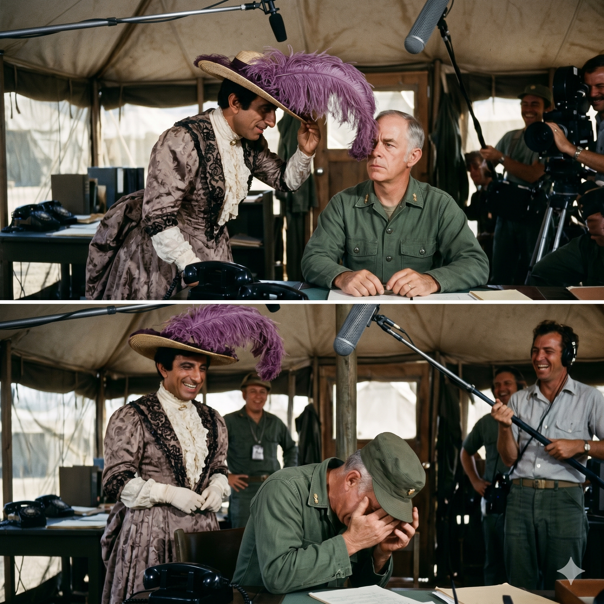 He was on the floor of the 4077th office, a veteran of fifty years in Hollywood, rolling around because a man in a dress gave him a look.
