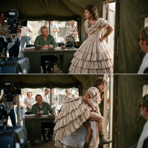 We were filming at the Malibu ranch, which, for those who don’t know, was essentially a beautiful, dusty oven. It could be ninety-five degrees by ten in the morning, and the air would just sit there, heavy with the smell of dry brush and diesel from the generators. Most of the guys were in those thin olive-drab fatigues, which were miserable enough, but I was usually strapped into something involving three layers of crinoline, a corset, and a wig that felt like a wool hat.