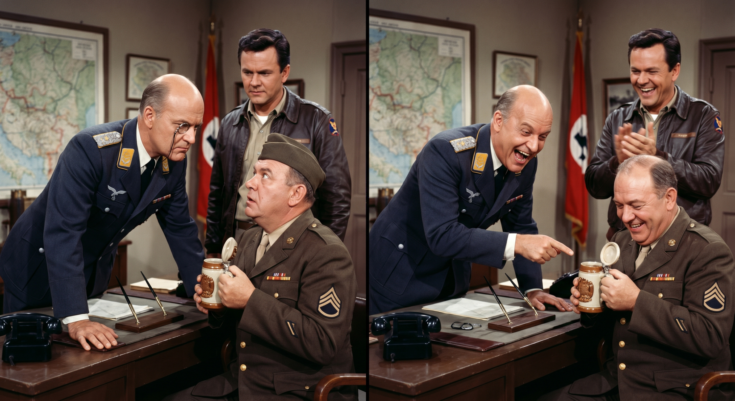 At that exact moment, John Banner, playing the ever-hungry Sergeant Schultz, was holding a prop mug of what was supposed to be hot cocoa, though by two in the morning, it was mostly cold, stagnant brown water.