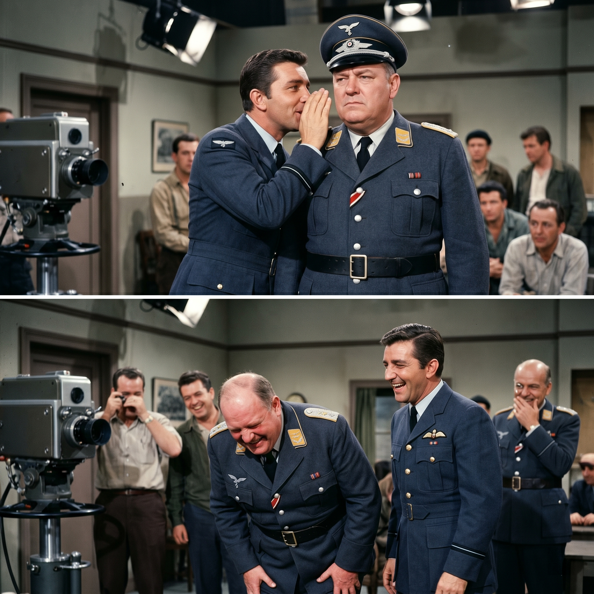 Werner Klemperer was standing there, trying to maintain the dignity of Colonel Klink, but eventually, even his monocle popped out.