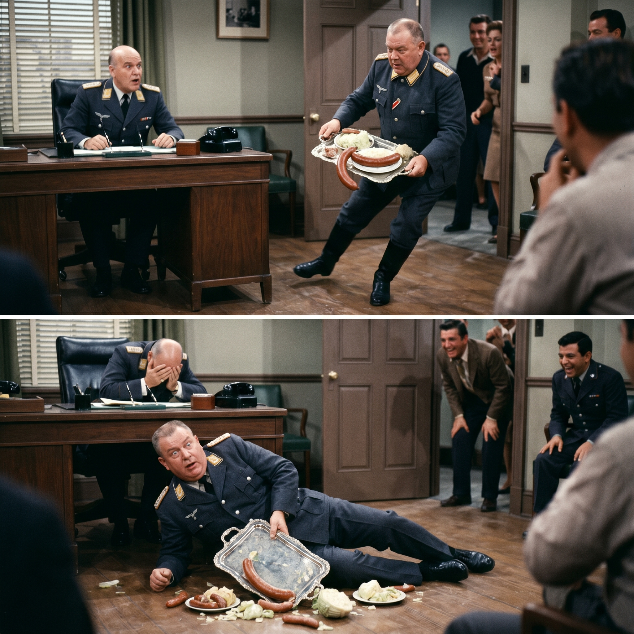 The scene was a standard interrogation in Klink’s office involving a very large, very elaborate tray of food.