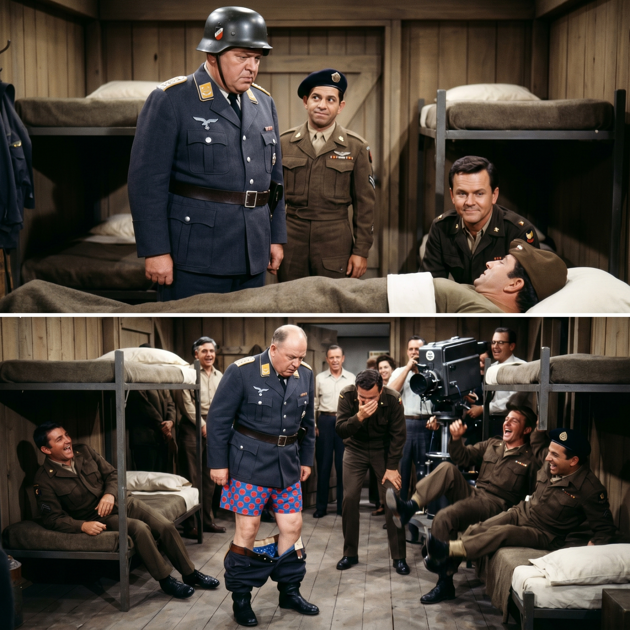 They were on take twelve of a scene where Schultz had to bend over and look under one of the bunks while LeBeau stood right behind him, mocking him in French.