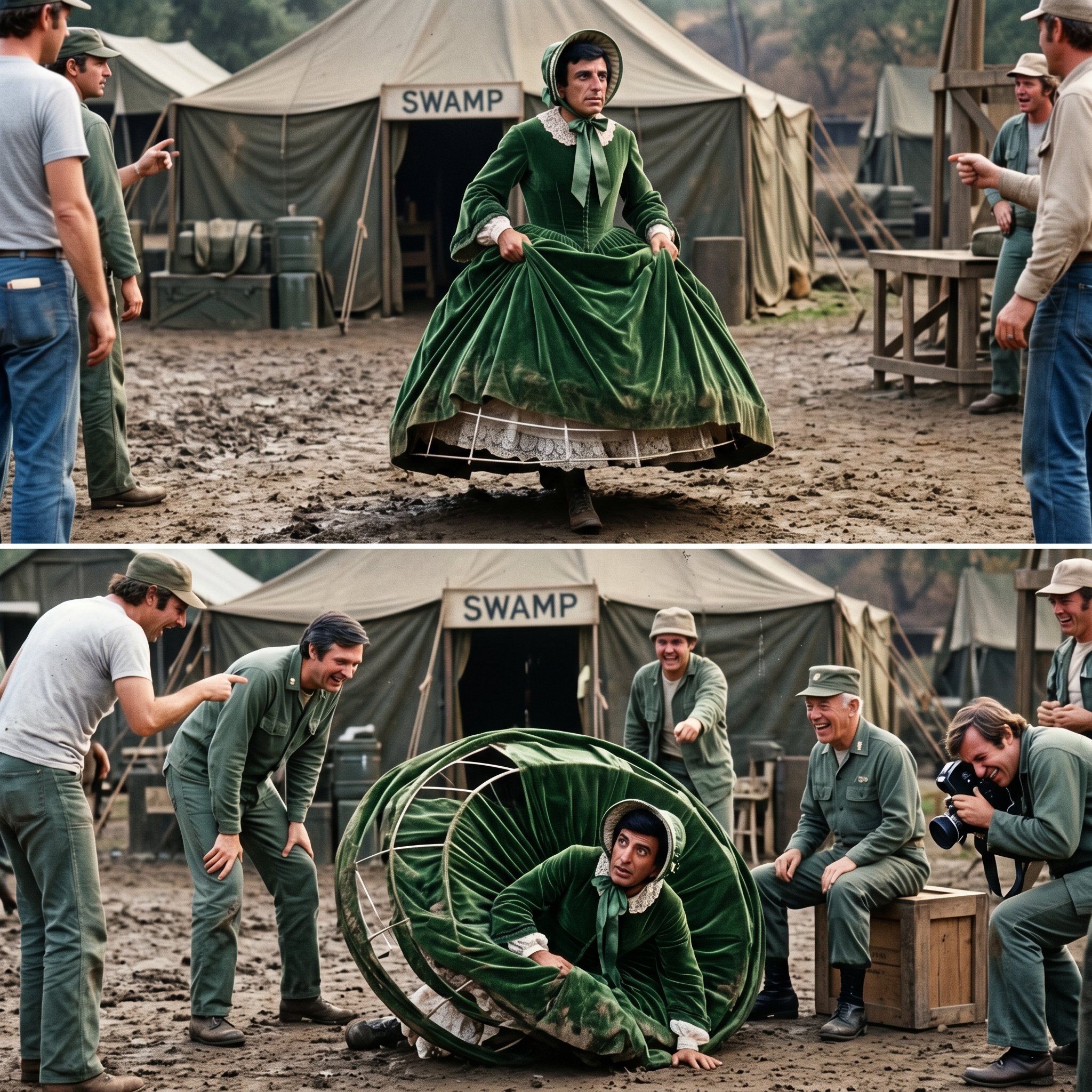 I was pinned to the ground, legs kicking uselessly in the air, completely buried in green velvet and white lace petticoats.