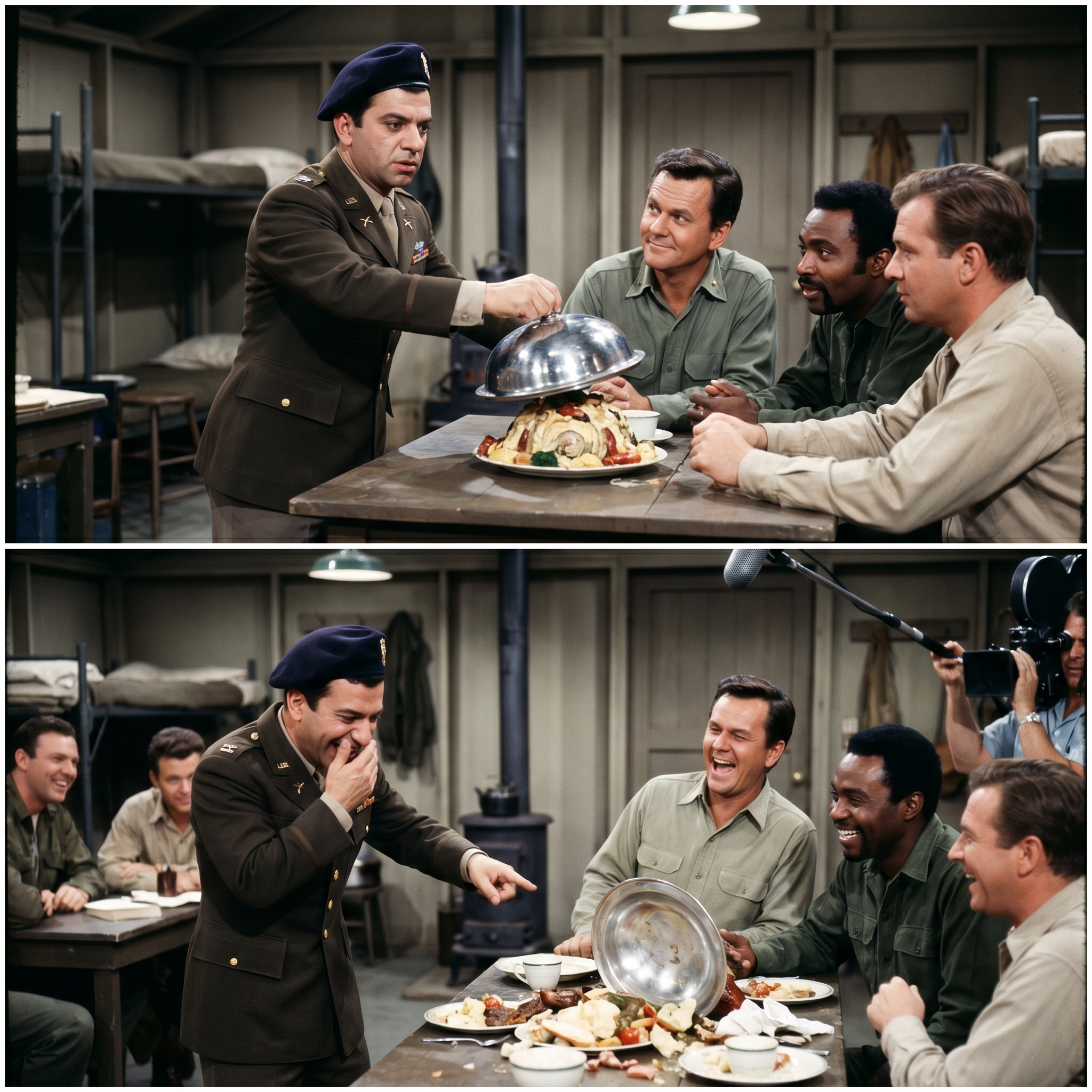 Then Werner Klemperer—Colonel Klink himself—wandered over during lunch. He had that monocle in, looking very stern, and he sat down across from me. He didn’t say a word for five minutes. He just ate his salad. Then, very slowly, he reached across the table, took his own wallet out, and pushed it toward me.