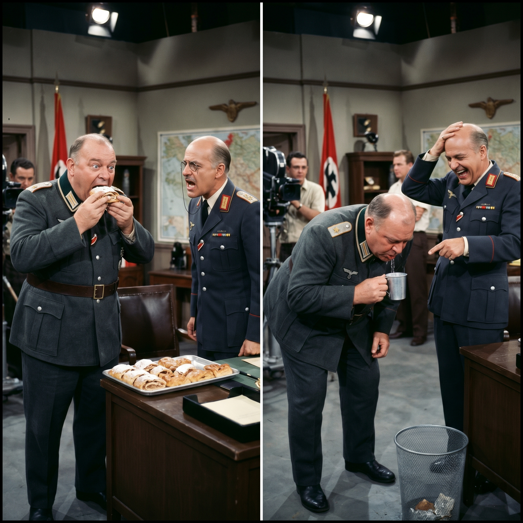 The scene was set in Colonel Klink’s office, and for once, the script called for a lavish spread of food to be laid out on the desk—a bribe for a visiting General.