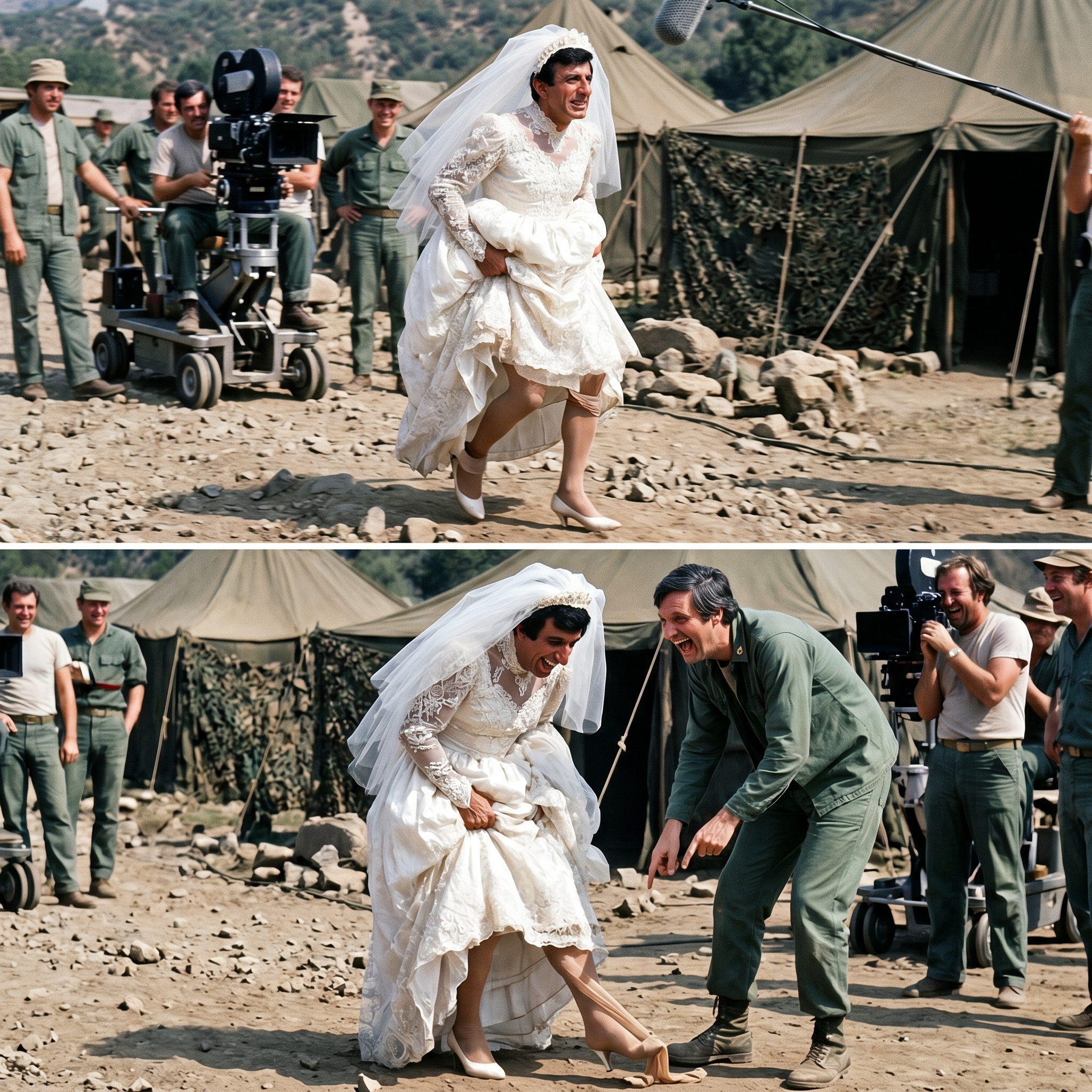 Alan Alda didn’t even try to hide it; he just doubled over, pointing at my feet where a roll of beige nylon was slowly peeking out from under the hem of the wedding gown.