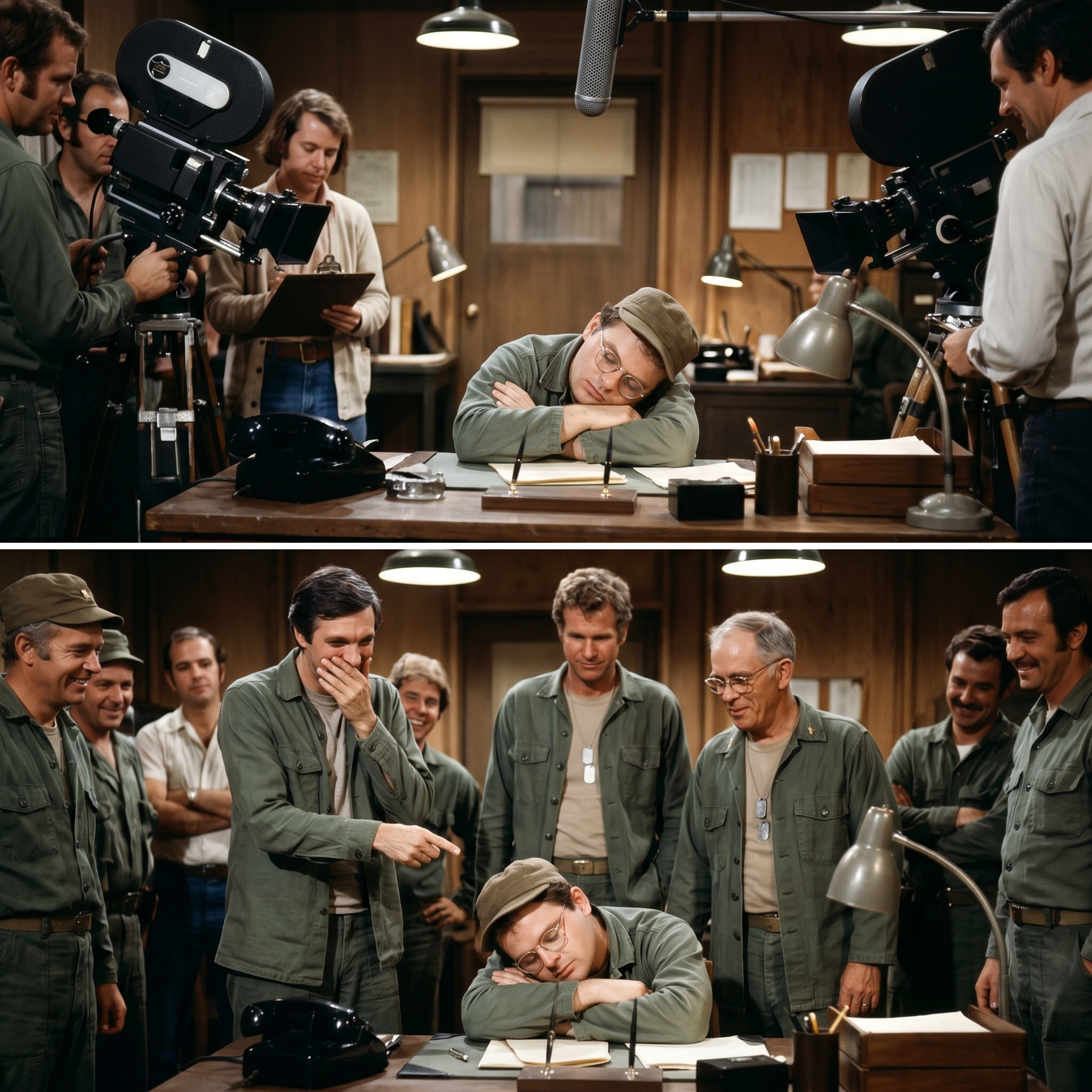 We were filming a scene in Radar’s office, which was basically a tiny wooden shack built inside the larger set.