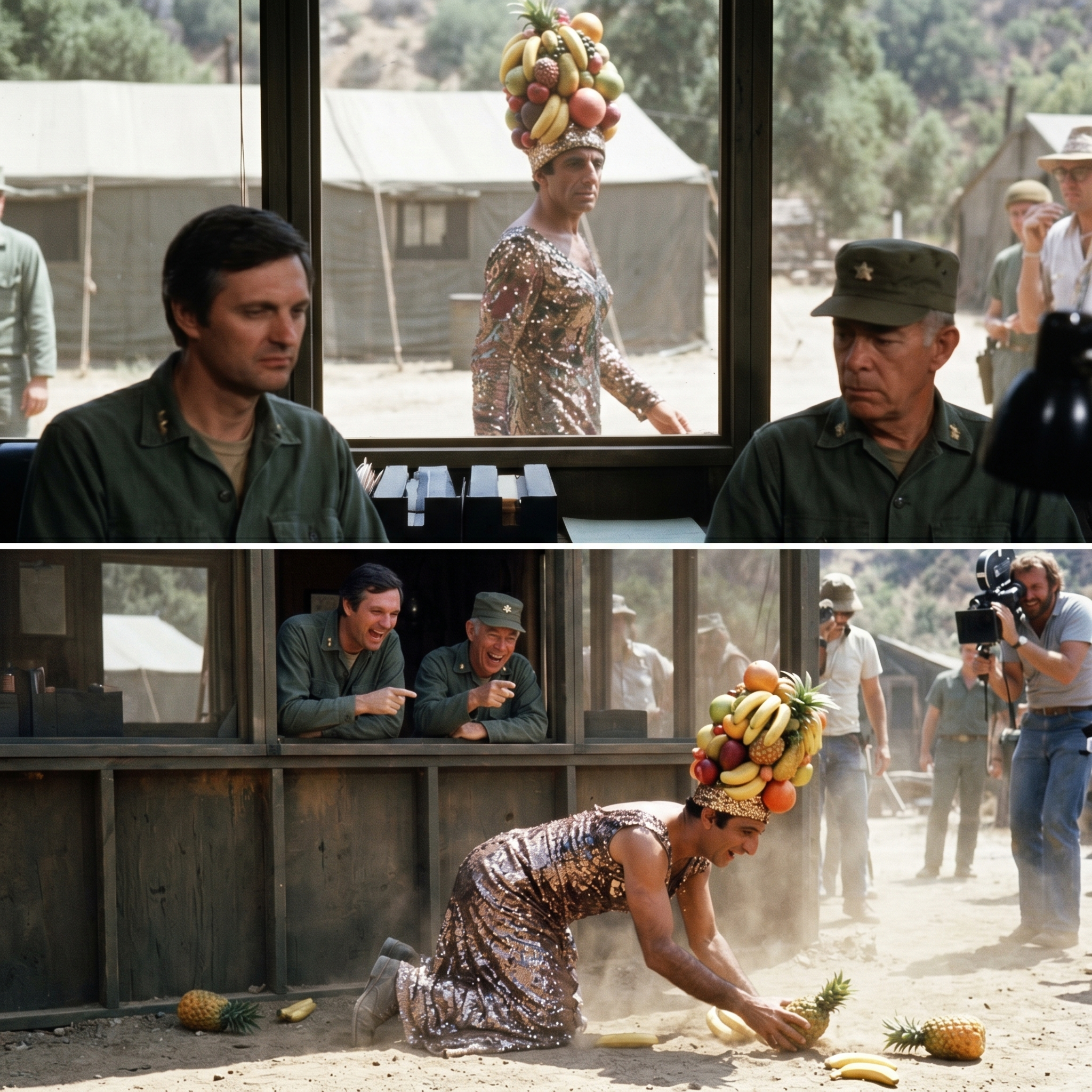 The pineapples started rolling across the dusty ground, and instead of stopping, I tried to stay in character as Klinger.